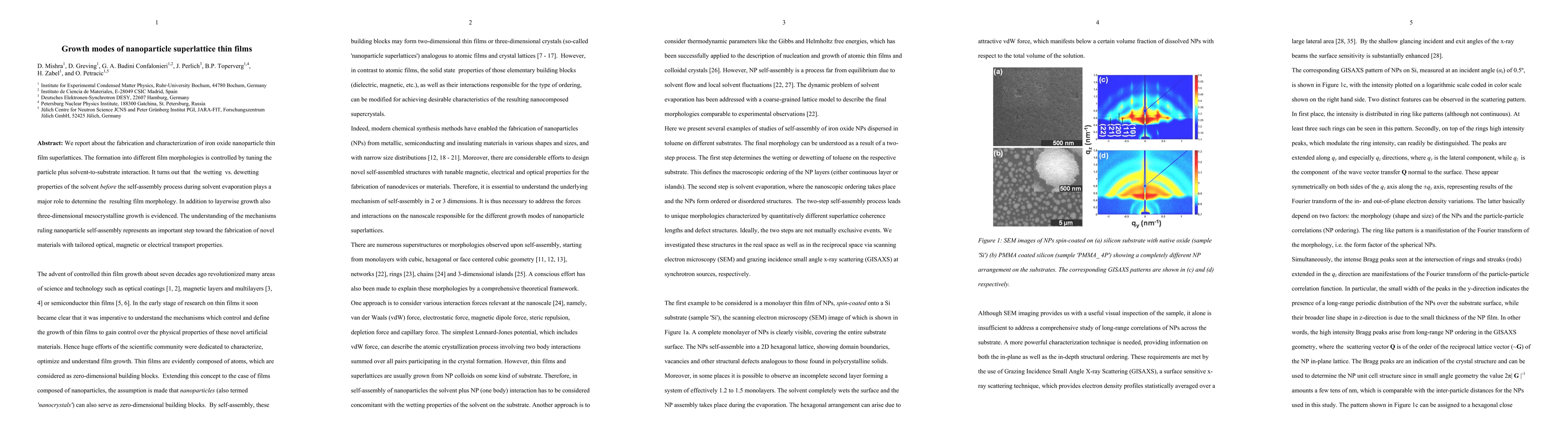 We report about the fabrication and characterization of iron oxide nanoparticle thin film superlattices. The formation into different film morphologies is controlled by tuning the particle plus solvent-to-substrate interaction. It turns out that the wetting vs. dewetting properties of the solvent before the self-assembly process during solvent evaporation plays a major role to determine the resulting film morphology. In addition to layerwise growth also three-dimensional mesocrystalline growth is evidenced. The understanding of the mechanisms ruling nanoparticle self-assembly represents an important step toward the fabrication of novel materials with tailored optical, magnetic or electrical transport properties.