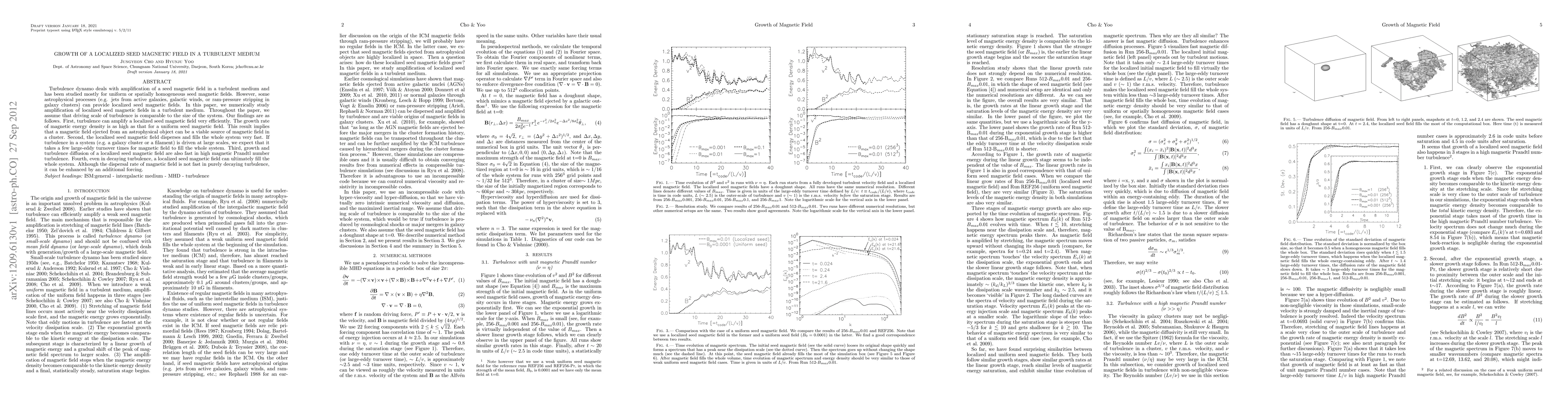 Turbulence dynamo deals with amplification of a seed magnetic field in a turbulent medium and has been studied mostly for uniform or spatially homogeneous seed magnetic fields. However, some astrophysical processes (e.g. jets from active galaxies, galactic winds, or ram-pressure stripping in galaxy clusters) can provide localized seed magnetic fields. In this paper, we numerically study amplification of localized seed magnetic fields in a turbulent medium. Throughout the paper, we assume that driving scale of turbulence is comparable to the size of the system. Our findings are as follows. First, turbulence can amplify a localized seed magnetic field very efficiently. The growth rate of magnetic energy density is as high as that for a uniform seed magnetic field. This result implies that a magnetic field ejected from an astrophysical object can be a viable source of magnetic field in a cluster. Second, the localized seed magnetic field disperses and fills the whole system very fast. If turbulence in a system (e.g. a galaxy cluster or a filament) is driven at large scales, we expect that it takes a few large-eddy turnover times for magnetic field to fill the whole system. Third, growth and turbulence diffusion of a localized seed magnetic field are also fast in high magnetic Prandtl number turbulence. Fourth, even in decaying turbulence, a localized seed magnetic field can ultimately fill the whole system. Although the dispersal rate of magnetic field is not fast in purely decaying turbulence, it can be enhanced by an additional forcing.