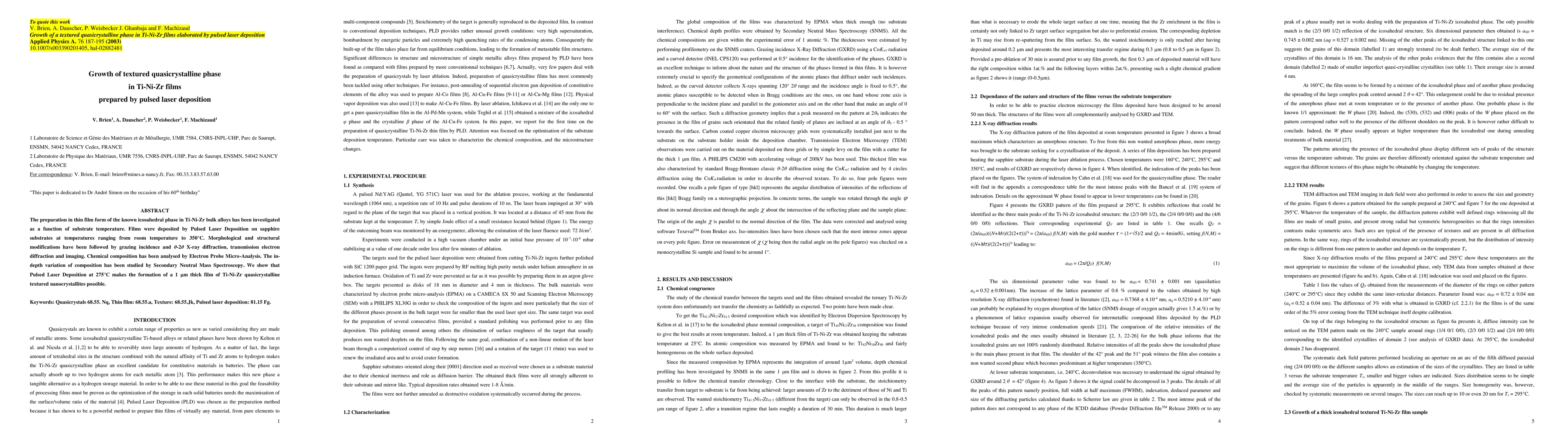 The preparation in thin film form of the known icosahedral phase in Ti-Ni-Zr bulk alloys has been investigated as a function of substrate temperature. Films were deposited by Pulsed Laser Deposition on sapphire substrates at temperatures ranging from room temperature to 350$^\circ$C. Morphological and structural modifications have been followed by grazing incidence and $\theta$-2$\theta$ X-ray diffraction, transmission electron diffraction and imaging. Chemical composition has been analysed by Electron Probe Micro-Analysis. The in-depth variation of composition has been studied by Secondary Neutral Mass Spectroscopy. We show that Pulsed Laser Deposition at 275$^\circ$C makes the formation of a 1 m thick film of Ti-Ni-Zr quasicrystalline textured nanocrystallites possible.