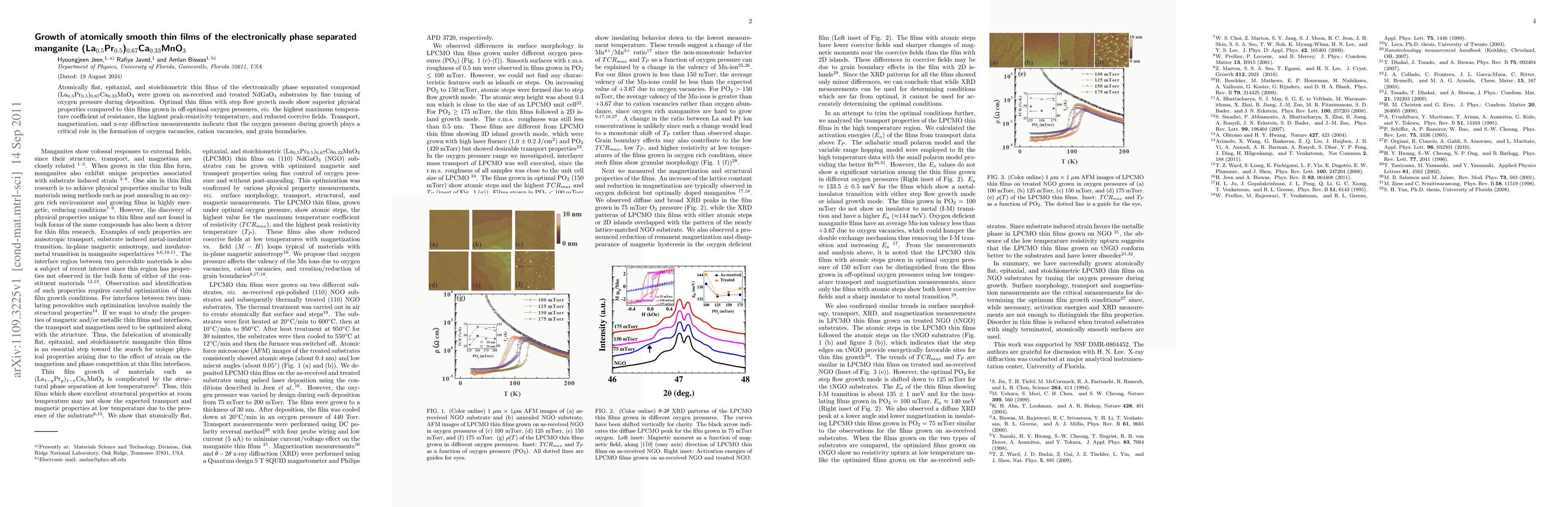 Atomically flat, epitaxial, and stoichiometric thin films of the electronically phase separated compound (La$_{0.5}$Pr$_{0.5}$)$_{0.67}$Ca$_{0.33}$MnO$_{3}$ were grown on as-received and treated NdGaO$_{3}$ substrates by fine tuning of oxygen pressure during deposition. Optimal thin films with step flow growth mode show superior physical properties compared to thin films grown in off-optimal oxygen pressures, {\em viz.} the highest maximum temperature coefficient of resistance, the highest peak-resistivity temperature, and reduced coercive fields. Transport, magnetization, and x-ray diffraction measurements indicate that the oxygen pressure during growth plays a critical role in the formation of oxygen vacancies, cation vacancies, and grain boundaries.