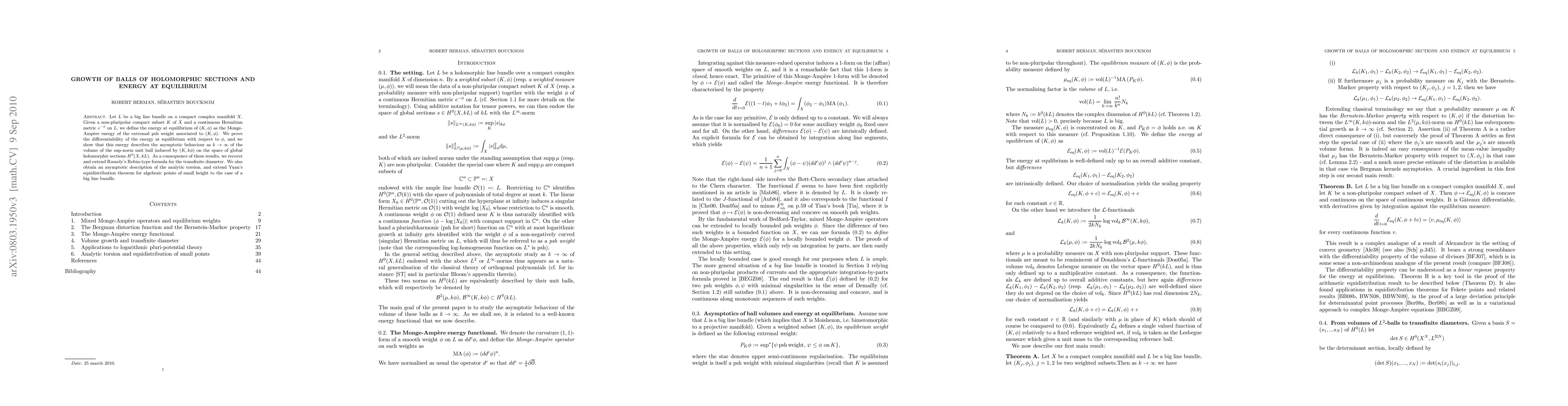 Let X be a compact complex manifold endowed with a big line bundle L. We define the energy at equilibrium of a weighted subset as the Monge-Ampere energy of the associated extremal plurisubharmonic weight. We prove the differentiability of the energy at equilibrium with respect to the weight, and show that this energy describes the asymptotic behaviour as k goes to infinity of the volume of the induced sup-norm unit ball in the space of global sections of kL. As a consequence of these results, we extend Rumely's Robin-type formula for the transfinite diameter. We also obtain an asymptotic description of the analytic torsion and extend Yuan's equidistribution theorem for algebraic points of small height to the case of a big line bundle.
