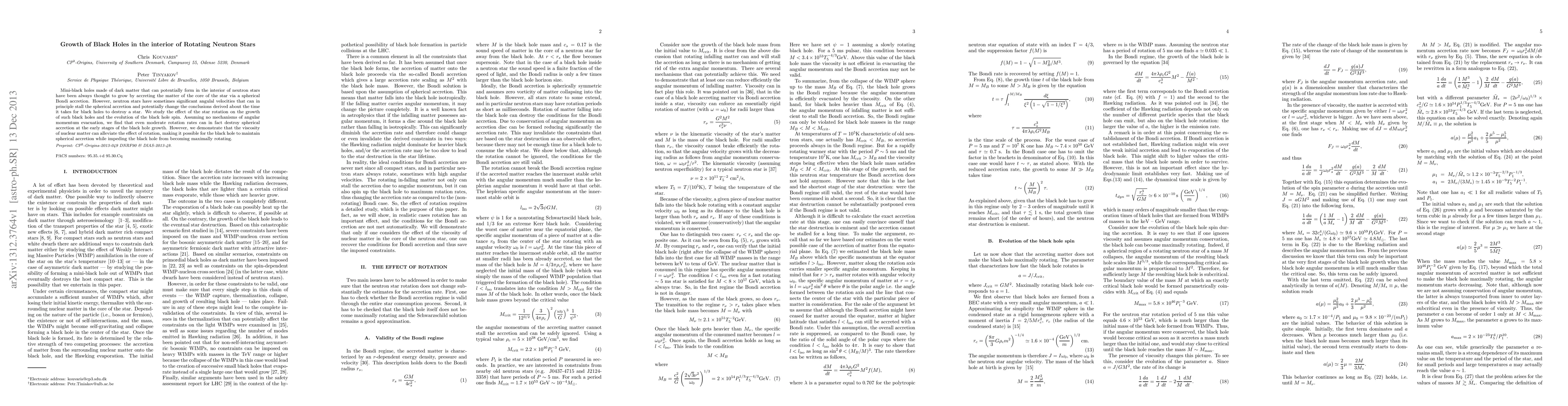 This paper investigates the growth of dark matter mini-black holes within rotating neutron stars, finding that significant angular velocities can disrupt spherical accretion. It concludes that nuclear matter viscosity can mitigate this effect, allowing for continued accretion while preventing the black hole from reaching maximal spin.