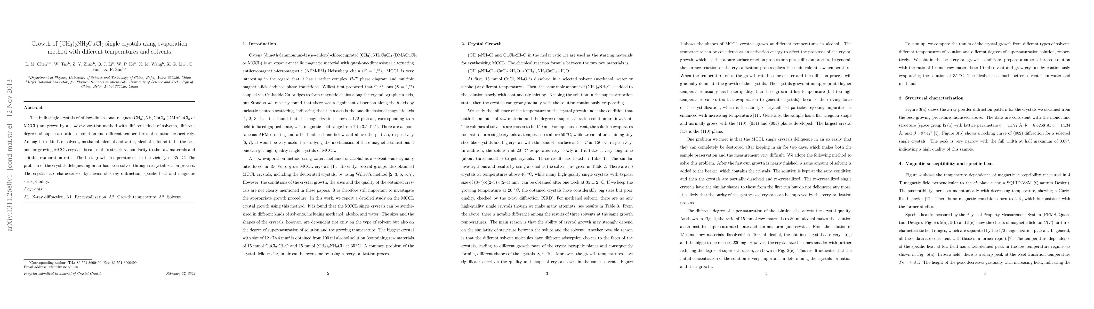 This study investigates the growth of (CH$_3$)$_2$NH$_2$CuCl$_3$ single crystals using a slow evaporation method with various solvents and temperatures. Alcohol is identified as the optimal solvent due to its structural similarity and suitable evaporation rate, with the best growth temperature around 35 $^{\circ}$C. The crystals are characterized by x-ray diffraction, specific heat, and magnetic susceptibility after overcoming deliquescence issues through recrystallization.