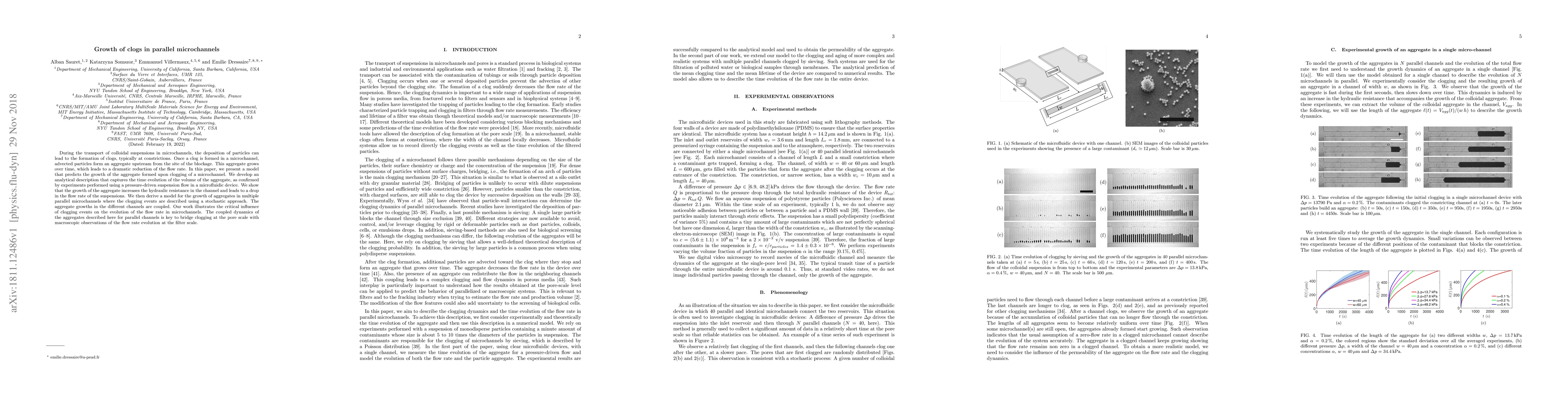This research presents a model predicting the growth of particle aggregates in clogged microchannels, confirmed by experiments. It also develops a stochastic model for aggregate growth in parallel microchannels, highlighting clogging's impact on flow rate evolution, crucial for understanding pore-scale clogging and filter-scale flow rate changes.