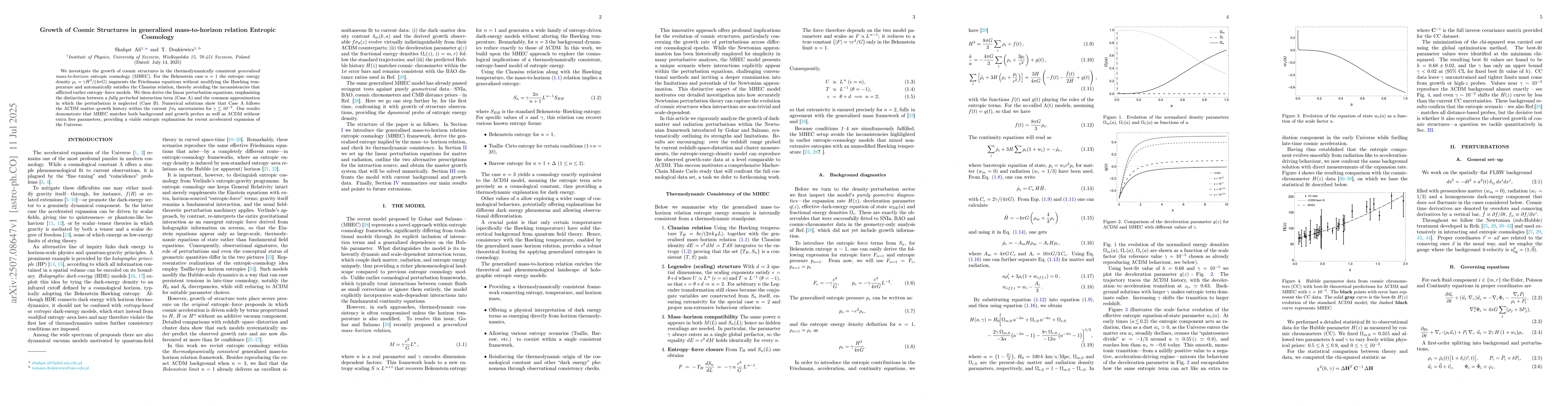 We investigate the growth of cosmic structures in the thermodynamically consistent generalised mass-to-horizon entropic cosmology (MHEC). For the Bekenstein case the entropic energy density augments the Friedmann equations without modifying the Hawking temperature and automatically satisfies the Clausius relation, thereby avoiding the inconsistencies that afflicted earlier entropy-force models. We then derive the linear perturbation equations, emphasising the distinction between a fully perturbed interaction term and the common approximation in which the perturbation is neglected. Numerical solutions show that fully perturbed follows the LCDM matter-growth history within the current growth uncertainties. Our results demonstrate that MHEC matches both background and growth probes as well as LCDM without extra free parameters, providing a viable entropic explanation for recent accelerated expansion of the Universe.