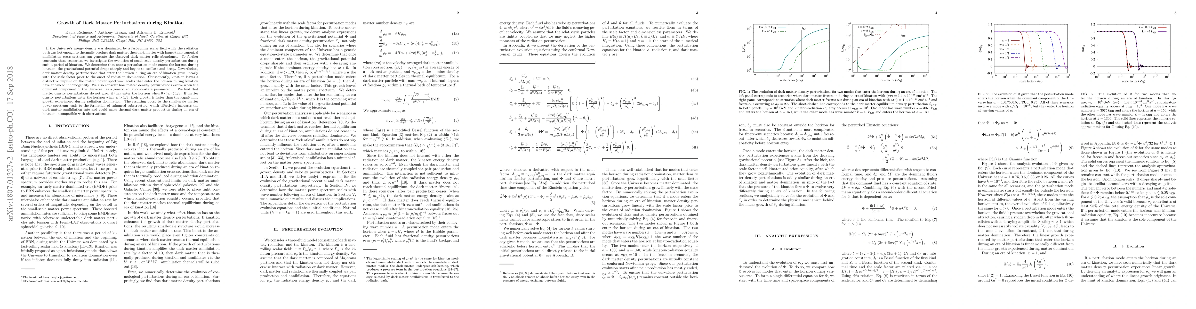 This paper investigates the evolution of dark matter perturbations during the kination phase, where the Universe's expansion is dominated by a fast-rolling scalar field. It finds that perturbations entering the horizon during kination grow linearly, leading to enhanced inhomogeneity in the matter power spectrum. Additionally, it explores the growth of perturbations under different equation-of-state parameters, concluding that perturbations grow faster than during radiation domination when the scalar field's equation of state exceeds 1/3.