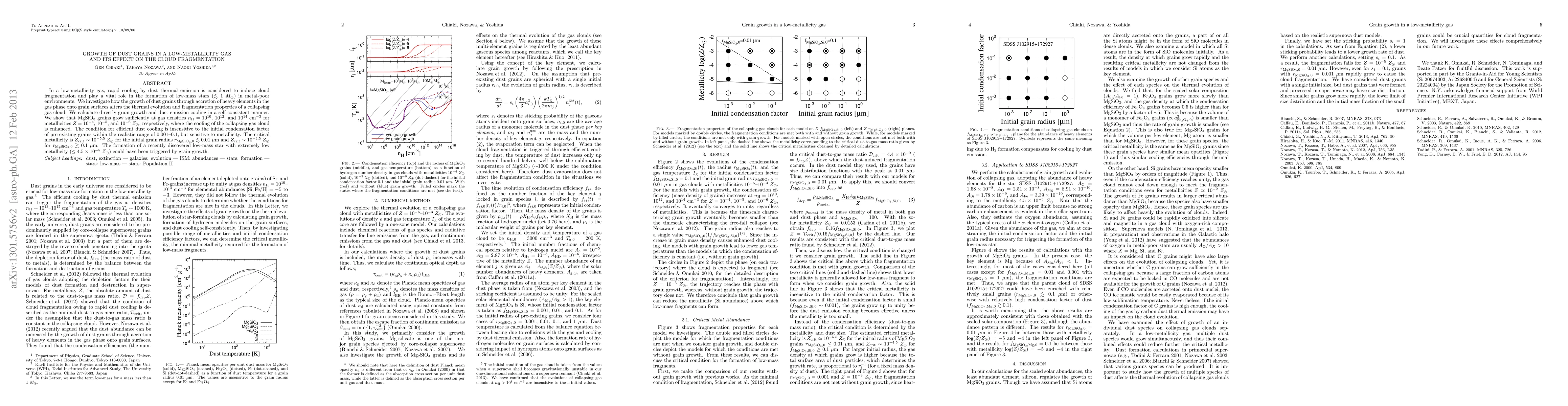 This paper explores how dust grain growth in low-metallicity gas influences cloud fragmentation and low-mass star formation. It finds that MgSiO3 grains grow sufficiently in low-metallicity environments, enhancing gas cooling and thus promoting fragmentation, with the critical metallicity for efficient cooling being around 10^{-5.5} Zsun for small grains.