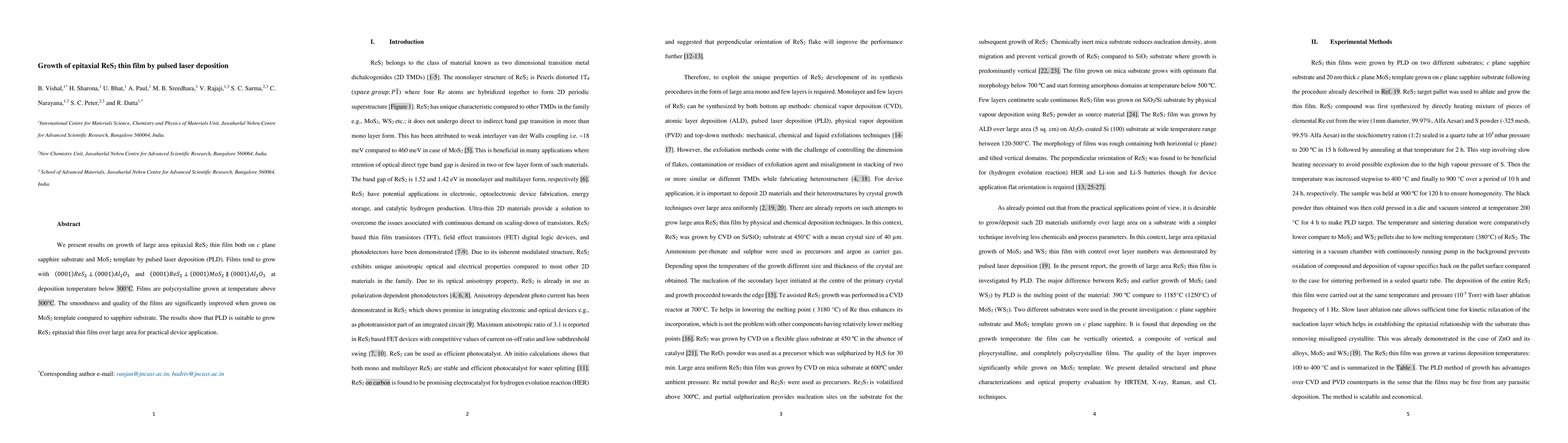 This study demonstrates the growth of epitaxial ReS2 thin films using pulsed laser deposition (PLD) on c-plane sapphire and MoS2 templates. Films grown at temperatures below 300°C exhibit epitaxial alignment, while higher temperatures result in polycrystalline growth; films grown on MoS2 templates are smoother and higher quality than those on sapphire.