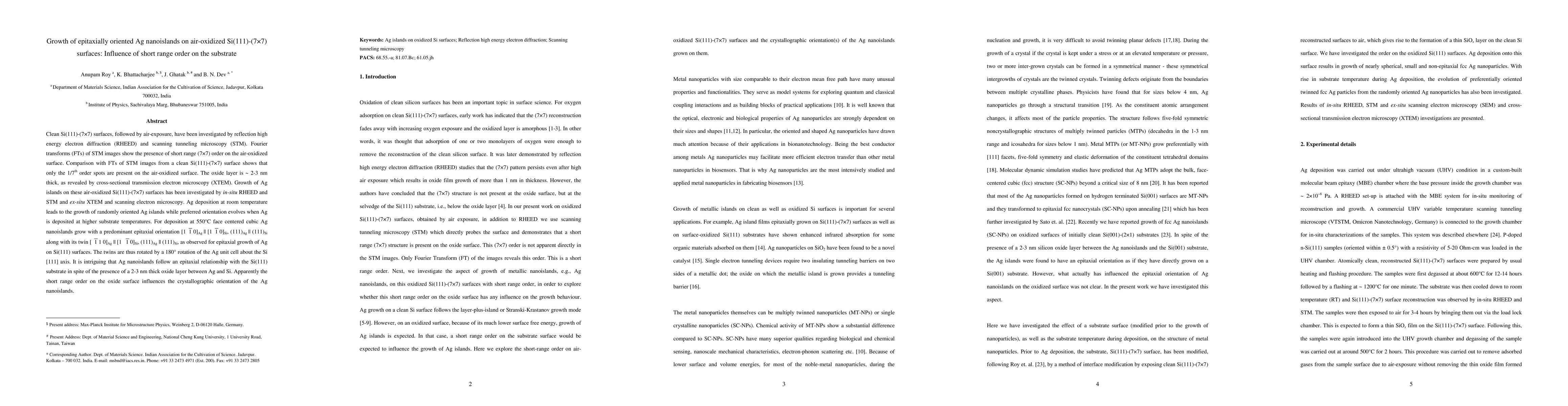The paper investigates the growth of epitaxially oriented Ag nanoislands on air-oxidized Si(111)-(7x7) surfaces, revealing that short range order on the oxide layer influences the epitaxial orientation of Ag islands, which preferentially align despite the oxide layer.