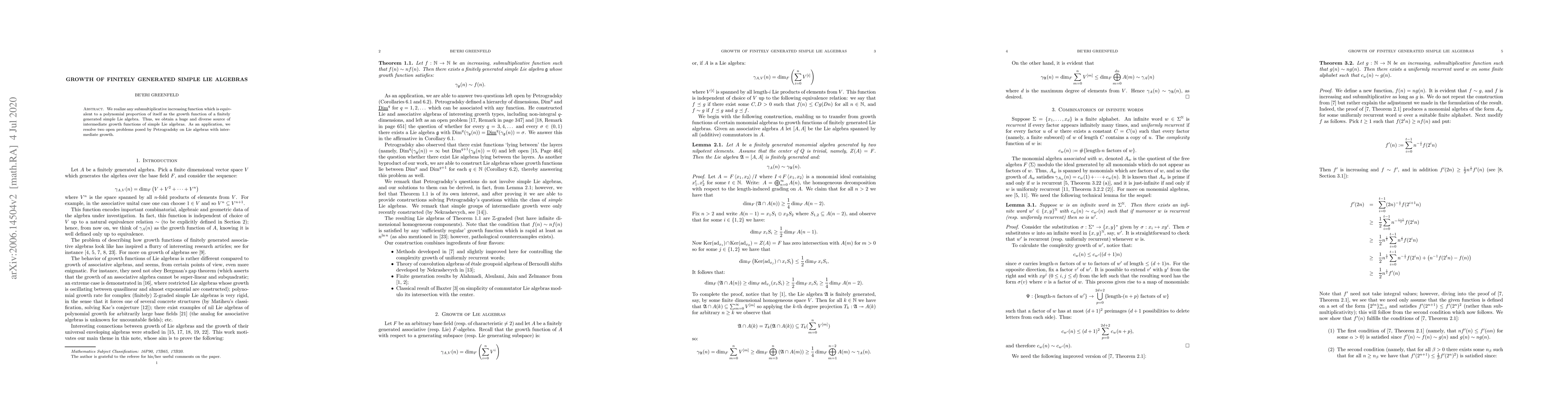 Summary: This paper establishes that any submultiplicative increasing function equivalent to a polynomial proportion of itself can serve as the growth function for finitely generated simple Lie algebras, thereby resolving two open problems regarding Lie algebras with intermediate growth posed by Petrogradsky.