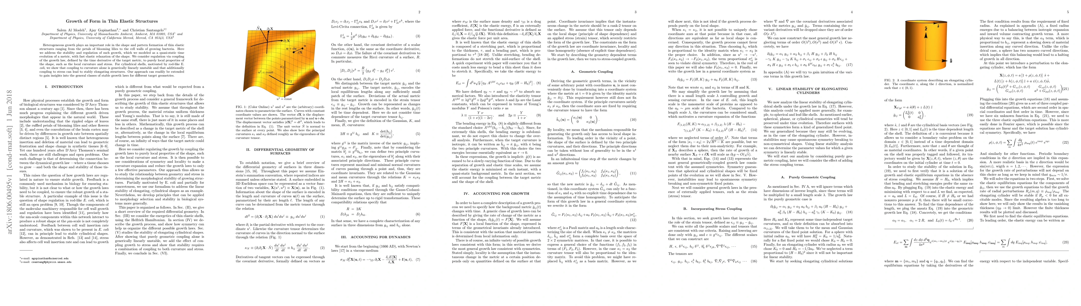 Researchers studied how thin elastic structures grow into stable shapes, finding that coupling growth to stress leads to stable elongation in cylindrical shells, while coupling only to curvature is unstable.