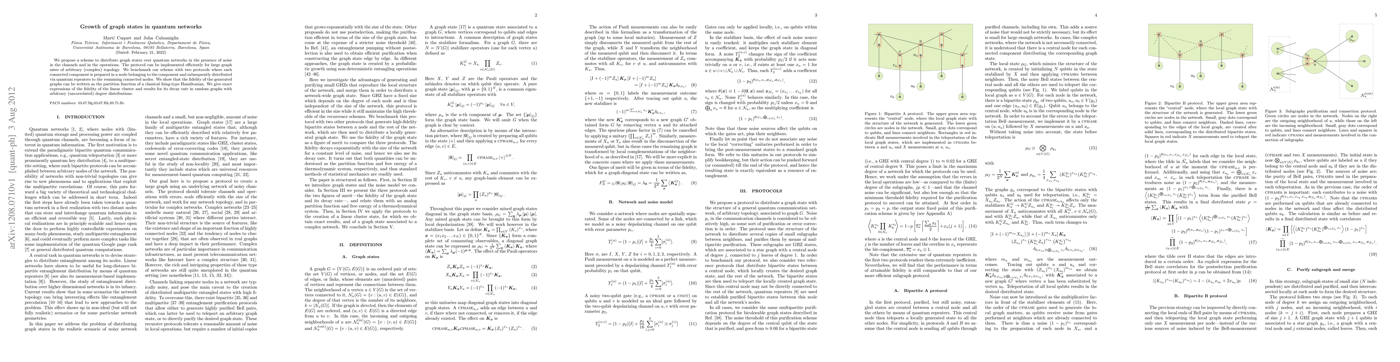 We propose a scheme to distribute graph states over quantum networks in the presence of noise in the channels and in the operations. The protocol can be implemented efficiently for large graph sates of arbitrary (complex) topology. We benchmark our scheme with two protocols where each connected component is prepared in a node belonging to the component and subsequently distributed via quantum repeaters to the remaining connected nodes. We show that the fidelity of the generated graphs can be written as the partition function of a classical Ising-type Hamiltonian. We give exact expressions of the fidelity of the linear cluster and results for its decay rate in random graphs with arbitrary (uncorrelated) degree distributions.