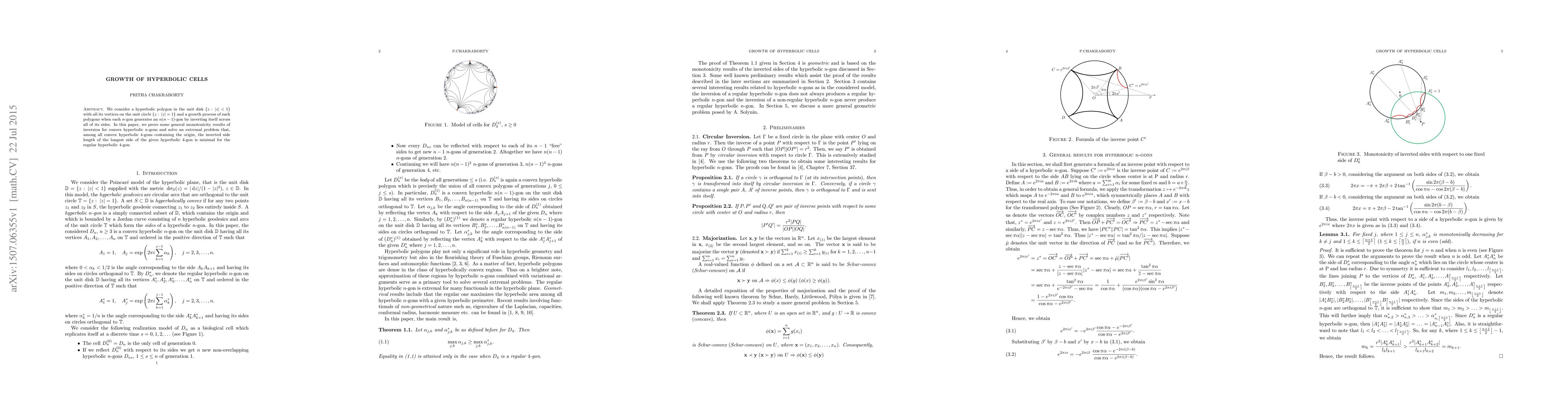 This paper explores the growth process of hyperbolic polygons in the unit disk, proving monotonicity results for inversion in convex hyperbolic $n$-gons and solving an extremal problem showing that the regular hyperbolic $4$-gon minimizes the longest side's inverted length among all convex hyperbolic $4$-gons containing the origin.
