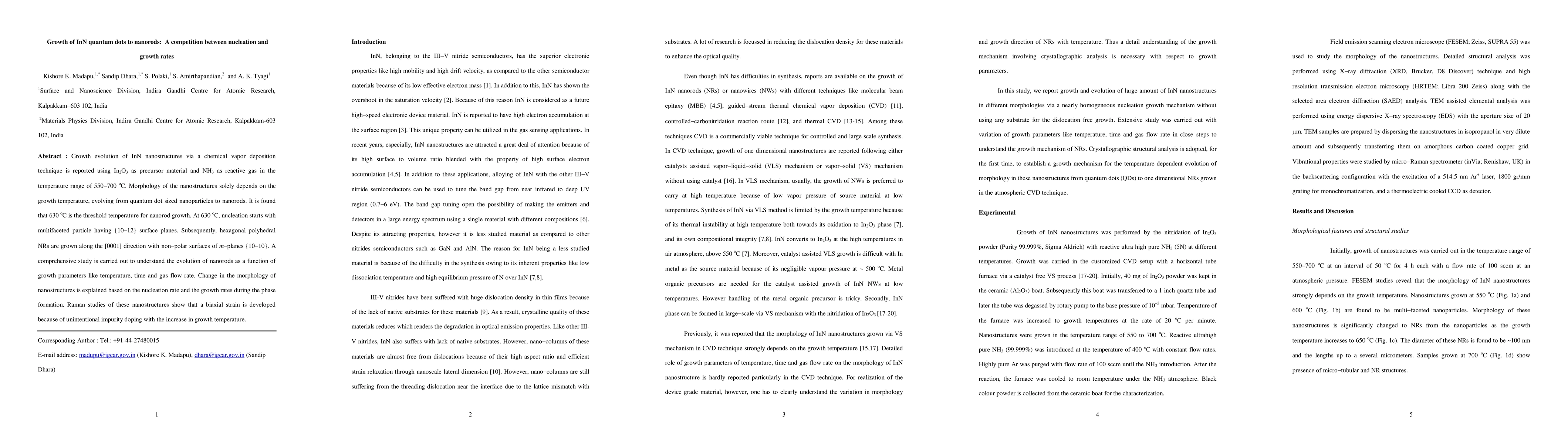 Growth evolution of InN nanostructures via a chemical vapor deposition technique is reported using In_2O_3 as precursor material and NH_3 as reactive gas in the temperature range of 550-700 ^oC. Morphology of the nanostructures solely depends on the growth temperature, evolving from quantum dot sized nanoparticles to nanorods. It is found that 630 ^oC is the threshold temperature for nanorod growth. At 630 ^oC, nucleation starts with multifaceted particle having {10-12} surface planes. Subsequently, hexagonal polyhedral NRs are grown along the [0001] direction with non-polar surfaces of m-planes {10-10}. A comprehensive study is carried out to understand the evolution of nanorods as a function of growth parameters like temperature, time and gas flow rate. Change in the morphology of nanostructures is explained based on the nucleation rate and the growth rates during the phase formation. Raman studies of these nanostructures show that a biaxial strain is developed because of unintentional impurity doping with the increase in growth temperature.