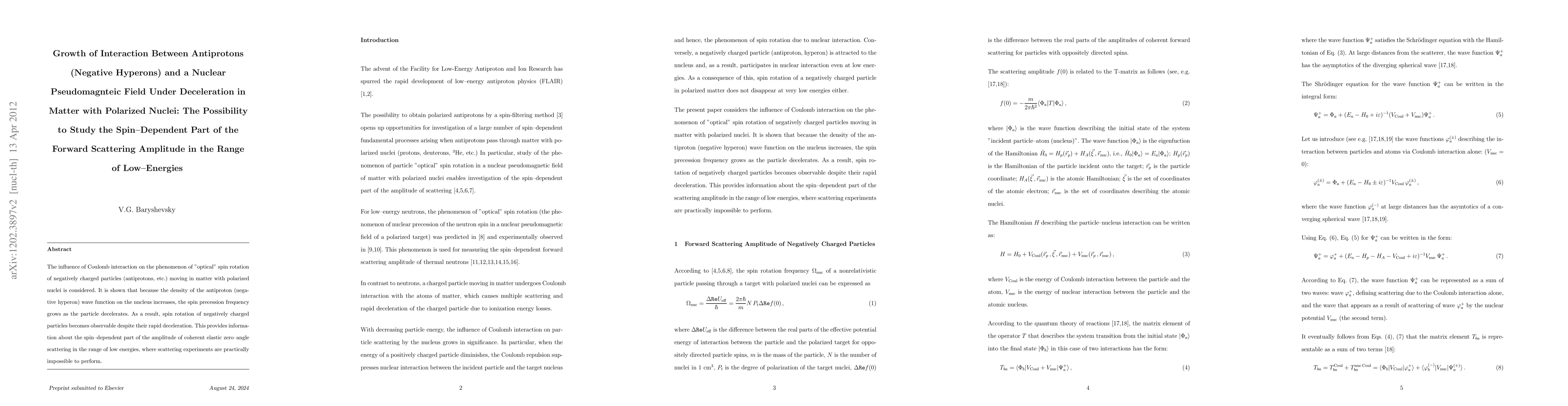 The influence of Coulomb interaction on the phenomenon of "optical" spin rotation of negatively charged particles (antiprotons, etc.) moving in matter with polarized nuclei is considered. It is shown that because the density of the antiproton (negative hyperon) wave function on the nucleus increases, the spin precession frequency grows as the particle decelerates. As a result, spin rotation of negatively charged particles becomes observable despite their rapid deceleration. This provides information about the spin--dependent part of the amplitude of coherent elastic zero--angle scattering in the range of low energies, where scattering experiments are practically impossible to perform.