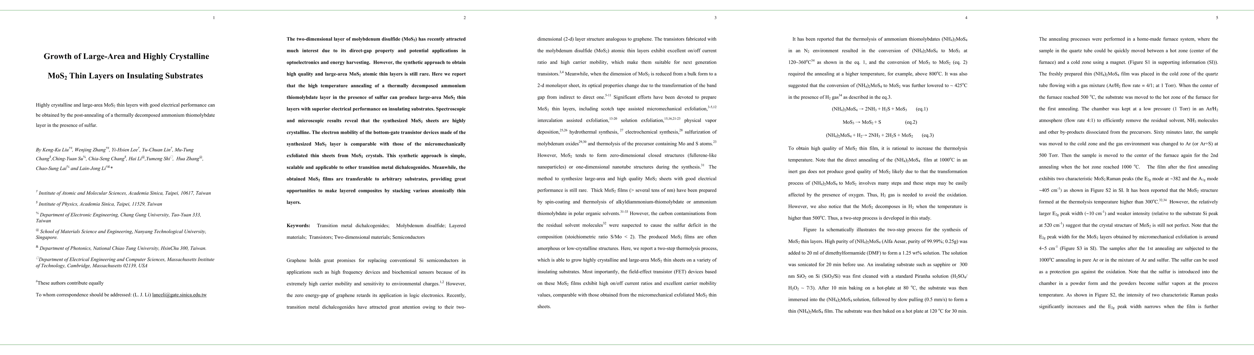 This paper reports a method for producing large-area, highly crystalline MoS2 thin layers on insulating substrates via high-temperature annealing of ammonium thiomolybdate with sulfur. The synthesized MoS2 exhibits comparable electron mobility to exfoliated thin sheets, indicating superior electrical performance.