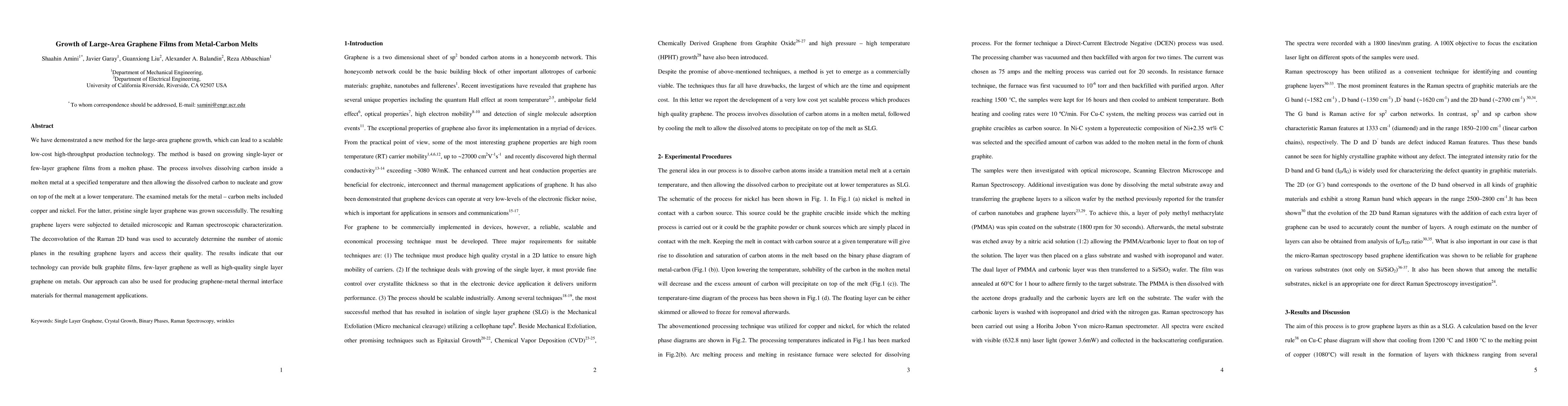 This paper presents a scalable method for large-area graphene growth from metal-carbon melts, achieving single-layer or few-layer graphene on copper and nickel substrates. The process involves dissolving carbon in a molten metal and allowing it to nucleate at a lower temperature, followed by detailed characterization confirming high-quality graphene layers.