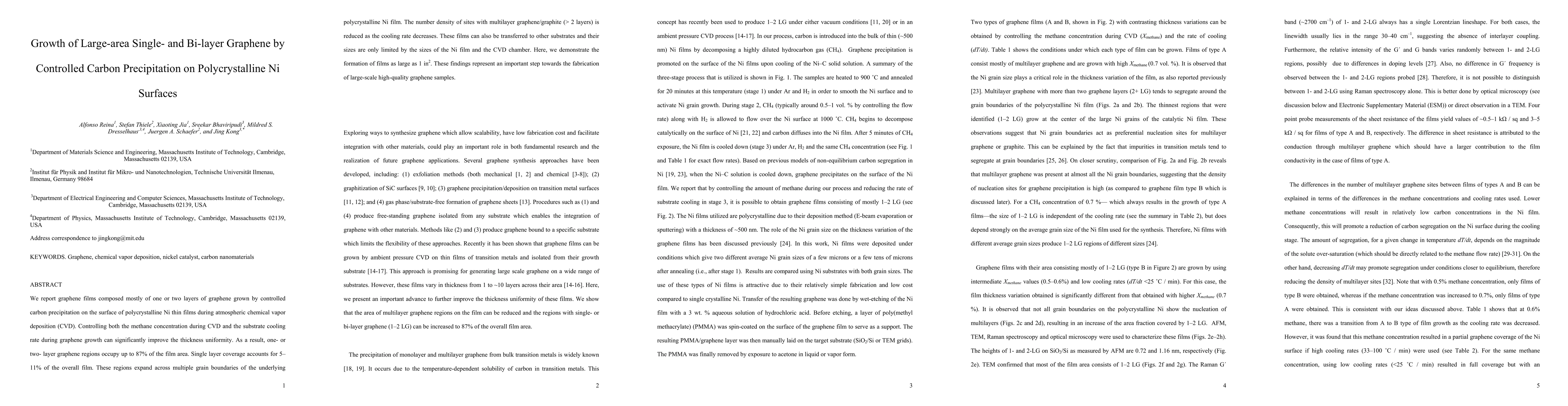This study details the growth of high-quality, large-area single- and bi-layer graphene films on polycrystalline Ni surfaces through controlled carbon precipitation during atmospheric CVD, achieving up to 87% coverage uniformity and demonstrating scalability up to 1 in². The method involves optimizing methane concentration and substrate cooling rates to enhance thickness uniformity and reduce multilayer regions.
