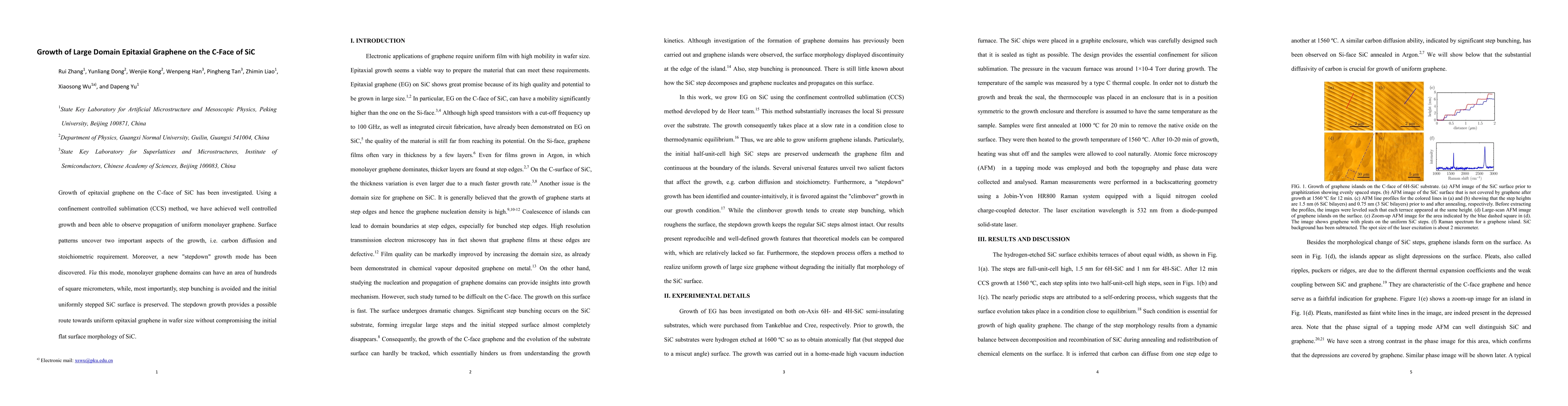 This study investigates the growth of large domain epitaxial graphene on SiC's C-face using a confinement controlled sublimation method, achieving uniform monolayer propagation. A new "stepdown" growth mode is identified that maintains surface morphology while avoiding step bunching.