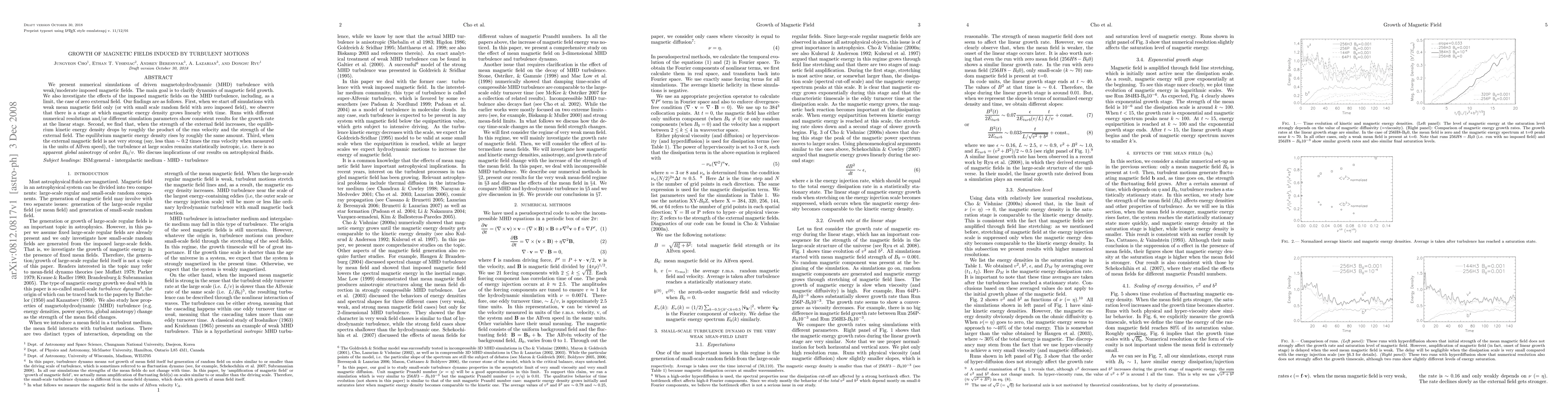 We present numerical simulations of driven magnetohydrodynamic (MHD) turbulence with weak/moderate imposed magnetic fields. The main goal is to clarify dynamics of magnetic field growth. We also investigate the effects of the imposed magnetic fields on the MHD turbulence, including, as a limit, the case of zero external field. Our findings are as follows. First, when we start off simulations with weak mean magnetic field only (or with small scale random field with zero imposed field), we observe that there is a stage at which magnetic energy density grows linearly with time. Runs with different numerical resolutions and/or different simulation parameters show consistent results for the growth rate at the linear stage. Second, we find that, when the strength of the external field increases, the equilibrium kinetic energy density drops by roughly the product of the rms velocity and the strength of the external field. The equilibrium magnetic energy density rises by roughly the same amount. Third, when the external magnetic field is not very strong (say, less than ~0.2 times the rms velocity when measured in the units of Alfven speed), the turbulence at large scales remains statistically isotropic, i.e. there is no apparent global anisotropy of order B_0/v. We discuss implications of our results on astrophysical fluids.