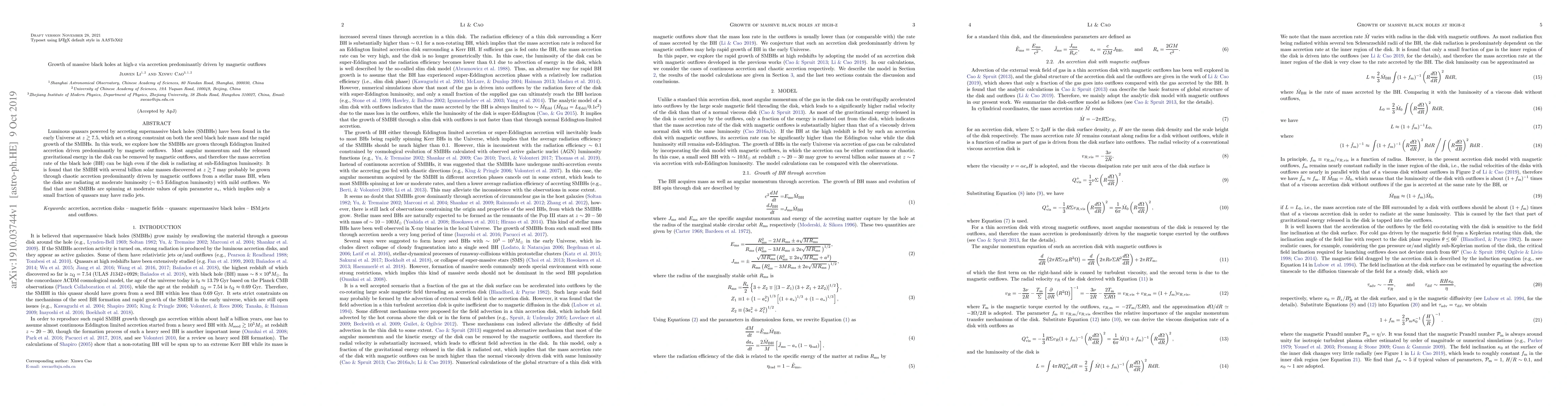 This paper investigates the rapid growth of supermassive black holes (SMBHs) in the early Universe via accretion driven by magnetic outflows, suggesting that these outflows can facilitate high mass accretion rates even at sub-Eddington luminosities, enabling the formation of SMBHs with billions of solar masses at high redshifts. The study concludes that most SMBHs likely have moderate spin parameters, implying few will host radio jets.