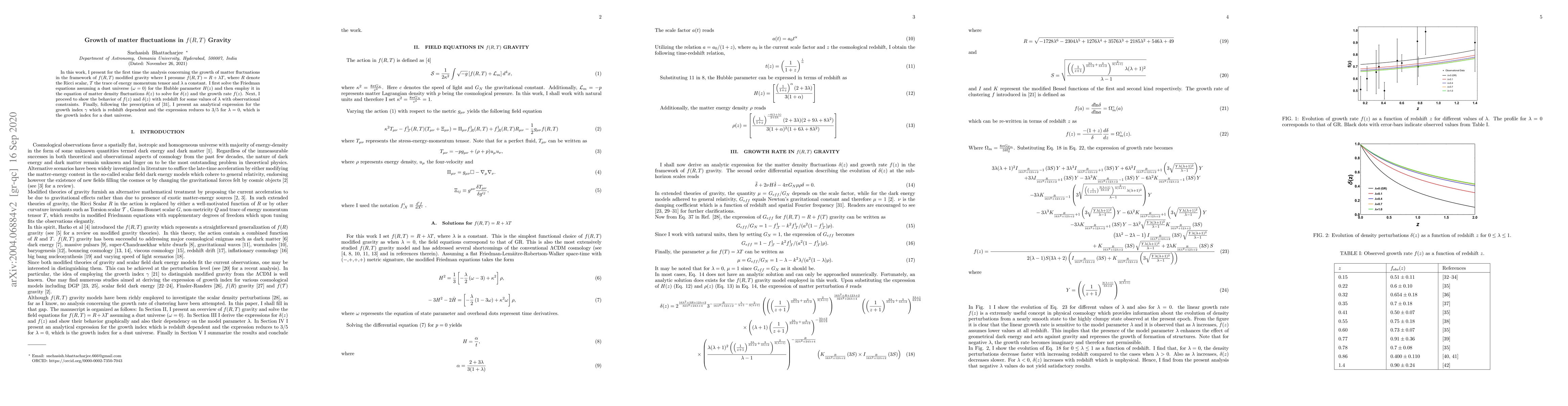 This paper analyzes the growth of matter fluctuations in the context of $f(R,T)$ modified gravity, specifically $f(R,T) = R + \lambda T$, and derives the growth rate $f(z)$ and density fluctuations $\delta(z)$ using Friedman equations for a dust universe. It also presents an analytical expression for the redshift-dependent growth index $\gamma$, which reduces to $3/5$ for $\lambda=0$.