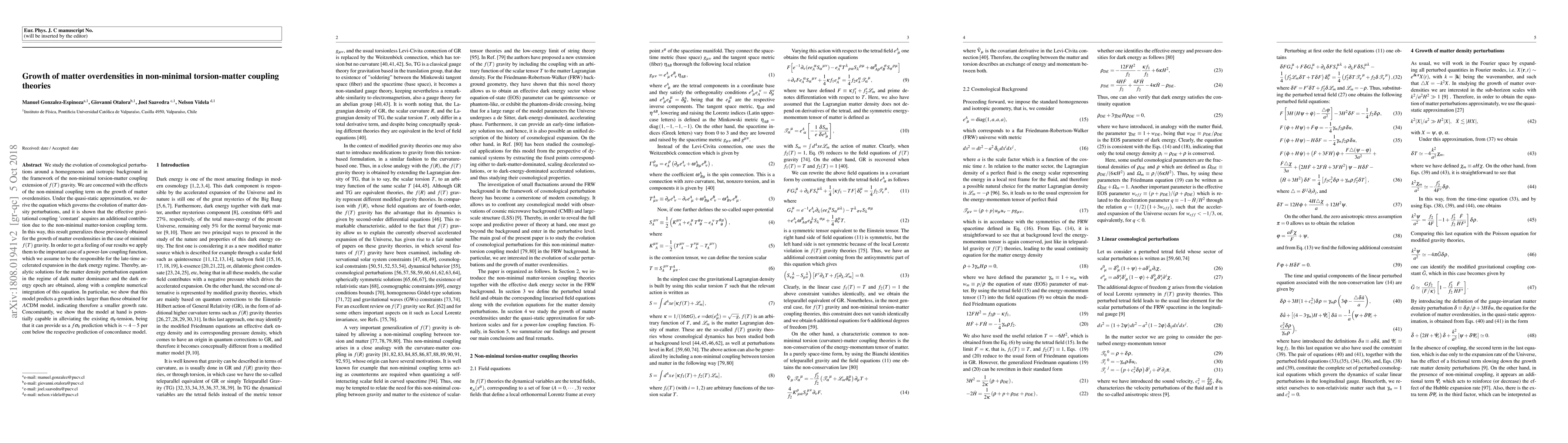 We study the evolution of cosmological perturbations around a homogeneous and isotropic background in the framework of the non-minimal torsion-matter coupling extension of $f(T)$ gravity. We are concerned with the effects of the non-minimal coupling term on the growth of matter overdensities. Under the quasi-static approximation, we derive the equation which governs the evolution of matter density perturbations, and it is shown that the effective gravitational coupling 'constant' acquires an additional contribution due to the non-minimal matter-torsion coupling term. In this way, this result generalizes those previously obtained for the growth of matter overdensities in the case of minimal $f(T)$ gravity. In order to get a feeling of our results we apply them to the important case of a power-law coupling function, which we assume to be the responsible for the late-time accelerated expansion in the dark energy regime. Thereby, analytic solutions for the matter density perturbation equation in the regime of dark matter dominance and the dark energy epoch are obtained, along with a complete numerical integration of this equation. In particular, we show that this model predicts a growth index larger than those obtained for $\Lambda$CDM model, indicating therefore a smaller growth rate. Concomitantly, we show that the model at hand is potentially capable in alleviating the existing $\sigma_{8}$-tension, being that it can provide us a $f\sigma_{8}$ prediction which is $\sim 4-5$ per cent below the respective prediction of concordance model.