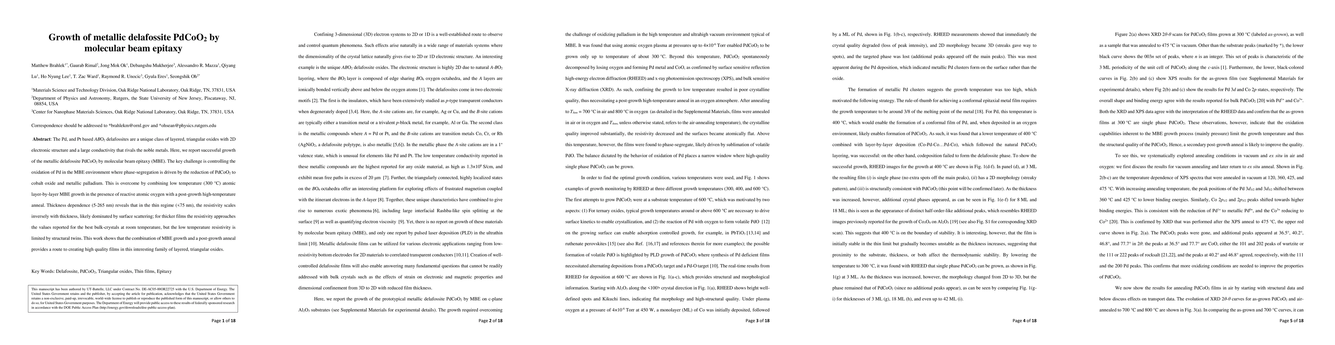 This paper reports the successful growth of metallic delafossite PdCoO2 using molecular beam epitaxy (MBE), overcoming challenges of Pd oxidation and phase segregation through low-temperature MBE and post-annealing. The study finds that resistivity in thin films is dominated by surface scattering, while thicker films approach bulk resistivity values, though low-temperature performance is limited by structural twins.