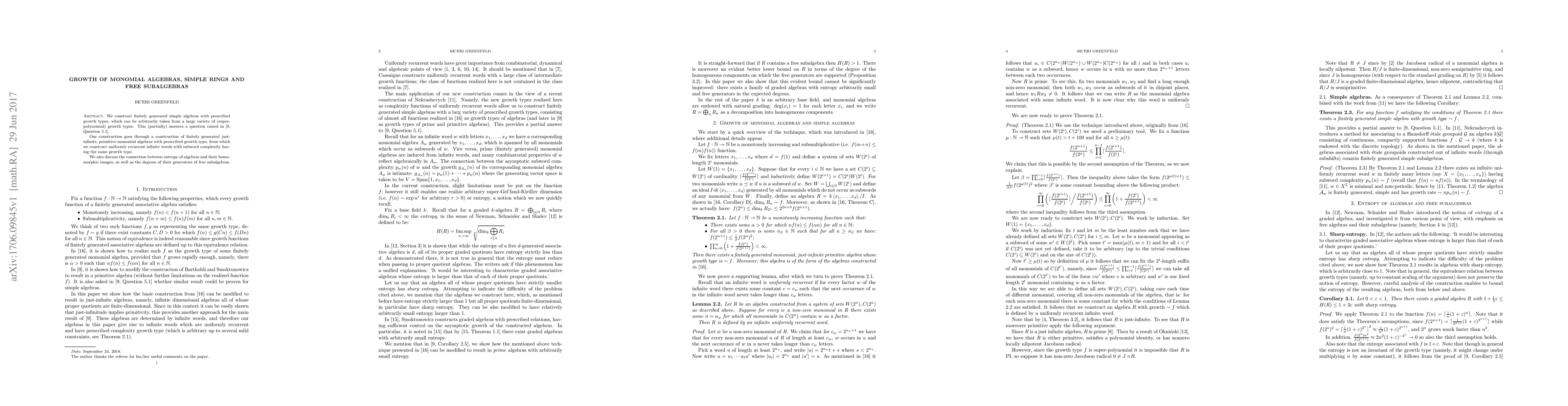 This research paper presents a method to construct finitely generated simple algebras with specified growth types, including super-polynomial ones, addressing a previous question. The approach involves creating finitely generated just-infinite, primitive monomial algebras, leading to uniformly recurrent infinite words with matching growth complexities. The study also explores connections between algebra entropy, homomorphic images, and degrees of free subalgebra generators.