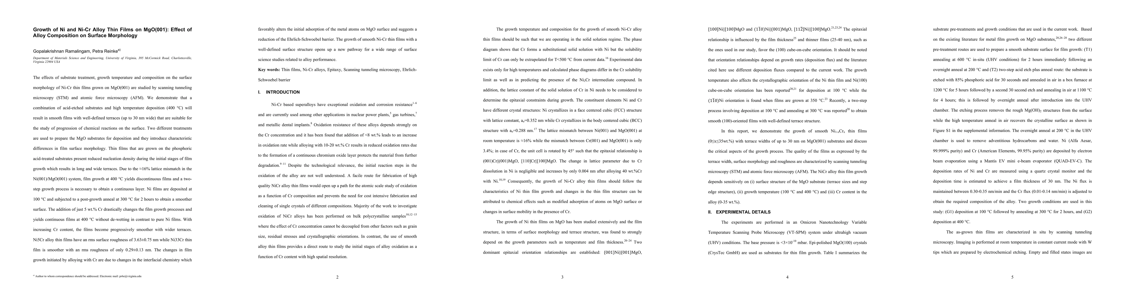 This study investigates the impact of alloy composition on the surface morphology of Ni-Cr thin films on MgO(001) using STM and AFM. The addition of Cr to Ni significantly enhances film smoothness and terrace width, suggesting a reduction in the Ehrlich-Schwoebel barrier and favorable interfacial chemistry.