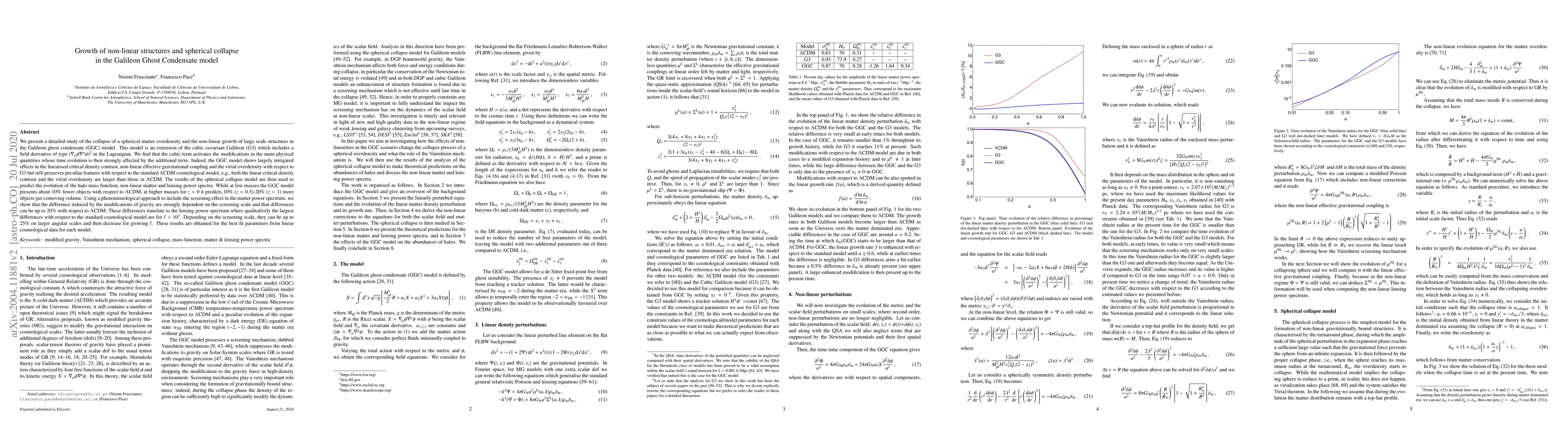 We present a detailed study of the collapse of a spherical matter overdensity and the non-linear growth of large scale structures in the Galileon ghost condensate (GGC) model. This model is an extension of the cubic covariant Galileon (G3) which includes a field derivative of type $(\nabla_\mu\phi\nabla^\mu\phi)^2$ in the Lagrangian. We find that the cubic term activates the modifications in the main physical quantities whose time evolution is then strongly affected by the additional term. Indeed, the GGC model shows largely mitigated effects in the linearised critical density contrast, non-linear effective gravitational coupling and the virial overdensity with respect to G3 but still preserves peculiar features with respect to the standard $\Lambda$CDM cosmological model, e.g. both the linear critical density contrast and the virial overdensity are larger than those in $\Lambda$CDM. The results of the spherical collapse model are then used to predict the evolution of the halo mass function, non-linear matter and lensing power spectra. While at low masses the GGC model presents about 10% fewer objects with respect to $\Lambda$CDM, at higher masses for $z>0$ it predicts 10% ($z=0.5$)-20% ($z=1$) more objects per comoving volume. Using a phenomenological approach to include the screening effect in the matter power spectrum, we show that the difference induced by the modifications of gravity are strongly dependent on the screening scale and that differences can be up to 20% with respect to $\Lambda$CDM. These differences translate to the lensing power spectrum where qualitatively the largest differences with respect to the standard cosmological model are for $\ell<10^3$. Depending on the screening scale, they can be up to 25% on larger angular scales and then decrease for growing $\ell$. These results are obtained for the best fit parameters from linear cosmological data for each model.