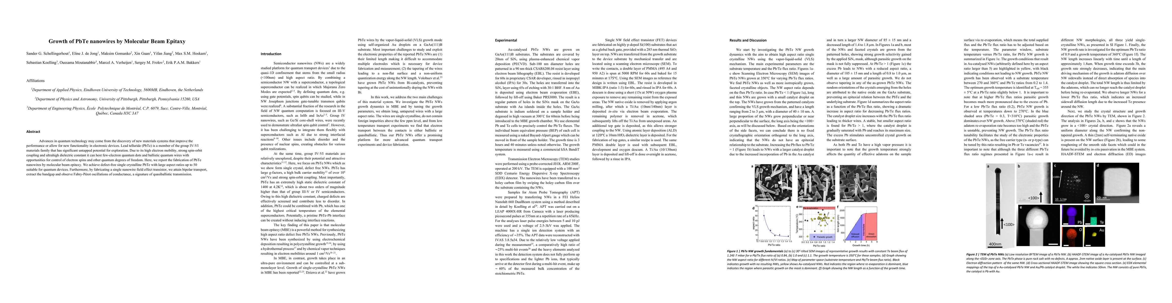 This paper reports the successful fabrication of defect-free, single crystalline PbTe nanowires using molecular beam epitaxy, achieving large aspect ratios up to 50. The study also demonstrates bipolar transport and quasiballistic transmission in a single nanowire field effect transistor, highlighting PbTe's potential for quantum devices.