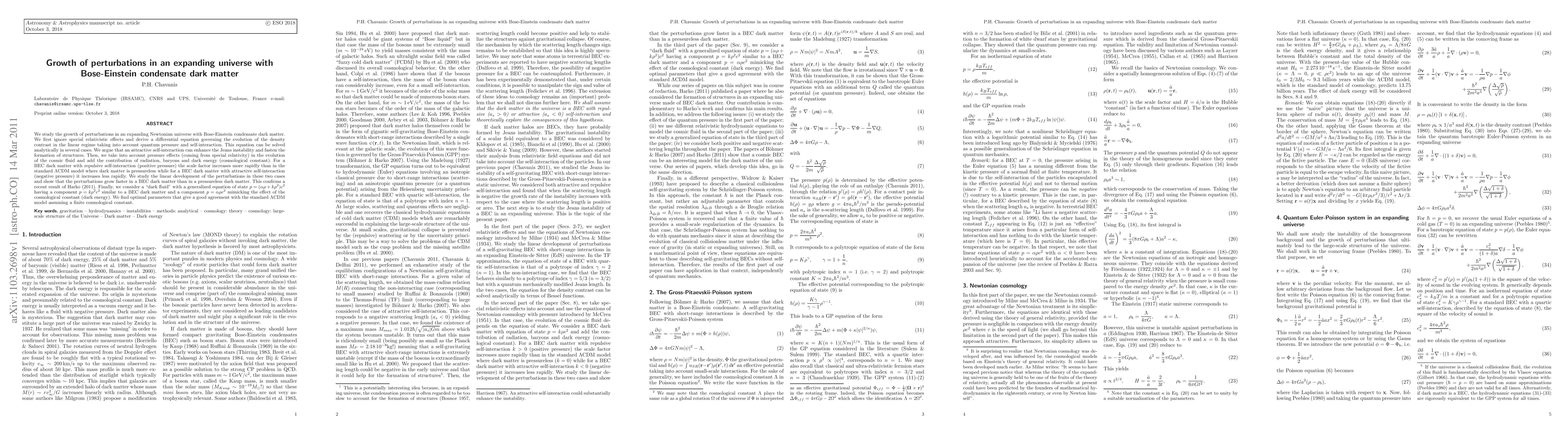 We study the growth of perturbations in an expanding Newtonian universe with Bose-Einstein condensate dark matter. We first ignore special relativistic effects and derive a differential equation governing the evolution of the density contrast in the linear regime taking into account quantum pressure and self-interaction. This equation can be solved analytically in several cases. We argue that an attractive self-interaction can enhance the Jeans instability and fasten the formation of structures. Then, we take into account pressure effects (coming from special relativity) in the evolution of the cosmic fluid and add the contribution of radiation, baryons and dark energy (cosmological constant). For a BEC dark matter with repulsive self-interaction (positive pressure) the scale factor increases more rapidly than in the standard \Lambda CDM model where dark matter is pressureless while for a BEC dark matter with attractive self-interaction (negative pressure) it increases less rapidly. We study the linear development of the perturbations in these two cases and show that the perturbations grow faster in a BEC dark matter than in a pressureless dark matter. This confirms a recent result of Harko (2011). Finally, we consider a "dark fluid" with a generalized equation of state p=(\alpha \rho + k \rho ^2)c^2 having a component p=k \rho ^2 c^2 similar to a BEC dark matter and a component p=\alpha \rho c^2 mimicking the effect of the cosmological constant (dark energy). We find optimal parameters that give a good agreement with the standard \Lambda CDM model assuming a finite cosmological constant.