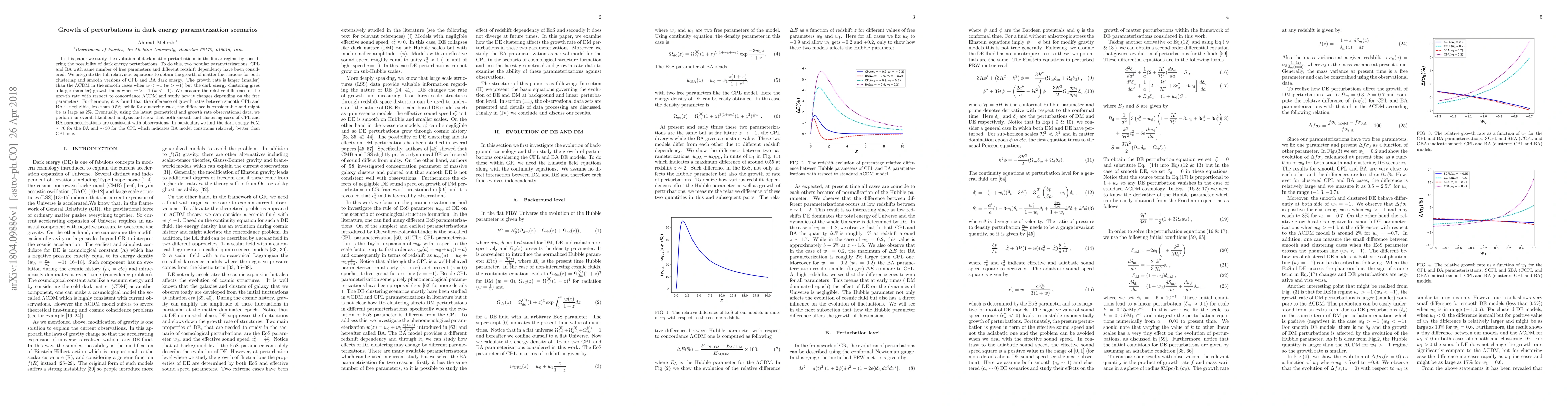 In this paper, we study the evolution of dark matter perturbations in the linear regime by considering the possibility of dark energy perturbations. To do this, two popular parameterizations, CPL and BA with same number of free parameters and different redshift dependency have been considered. We integrate the full relativistic equations to obtain the growth of matter fluctuations for both clustering and smooth versions of CPL and BA dark energy. The growth rate is larger (smaller) than the $\Lambda$CDM in the smooth cases when $w<-1$ ($w>-1$) but the dark energy clustering gives a larger (smaller) growth index when $w>-1$ ($w<-1$). We measure the relative difference of the growth rate with respect to concordance $\Lambda$CDM and study how it changes depending on the free parameters. Furthermore, it is found that the difference of growth rates between smooth CPL and BA is negligible, less than $0.5\%$, while for clustering case, the difference is considerable and might be as large as 2$\%$. Eventually, using the latest geometrical and growth rate observational data, we perform an overall likelihood analysis and show that both smooth and clustering cases of CPL and BA parameterizations are consistent with observations. In particular, we find the dark energy FoM $\sim70$ for the BA and $\sim30$ for the CPL which indicates BA model constraints relatively better than CPL one.