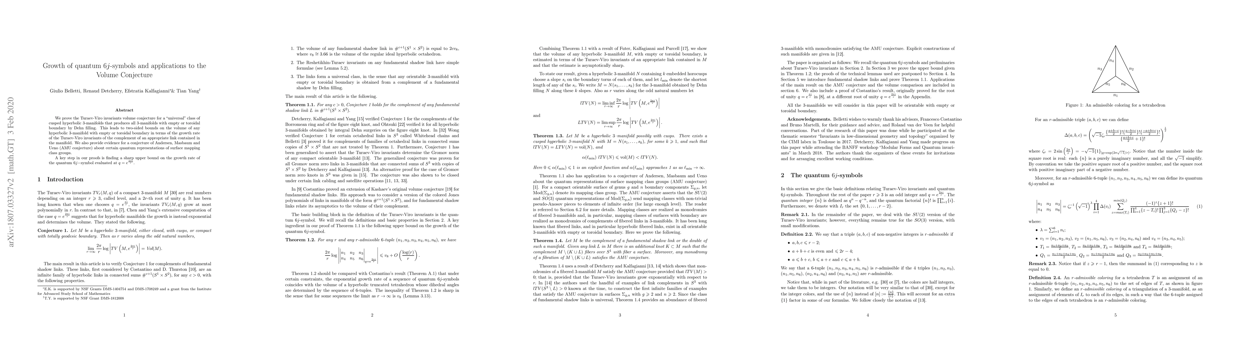 We prove the Turaev-Viro invariants volume conjecture for a "universal" class of cusped hyperbolic 3-manifolds that produces all 3-manifolds with empty or toroidal boundary by Dehn filling. This leads to two-sided bounds on the volume of any hyperbolic 3-manifold with empty or toroidal boundary in terms of the growth rate of the Turaev-Viro invariants of the complement of an appropriate link contained in the manifold. We also provide evidence for a conjecture of Andersen, Masbaum and Ueno (AMU conjecture) about certain quantum representations of surface mapping class groups. A key step in our proofs is finding a sharp upper bound on the growth rate of the quantum $6j-$symbol evaluated at $q=e^{\frac{2\pi i}{r}}.$