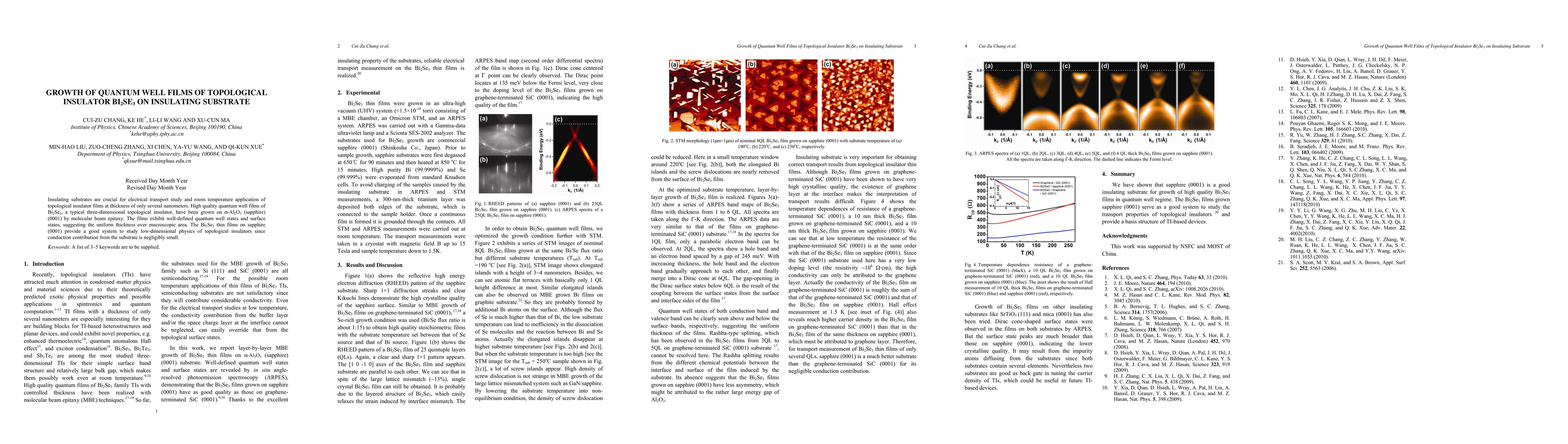 This study reports the growth of high-quality quantum well films of the topological insulator Bi2Se3 on insulating sapphire substrates via molecular beam epitaxy, revealing well-defined quantum and surface states, making it an ideal system for investigating the low-dimensional physics of topological insulators.