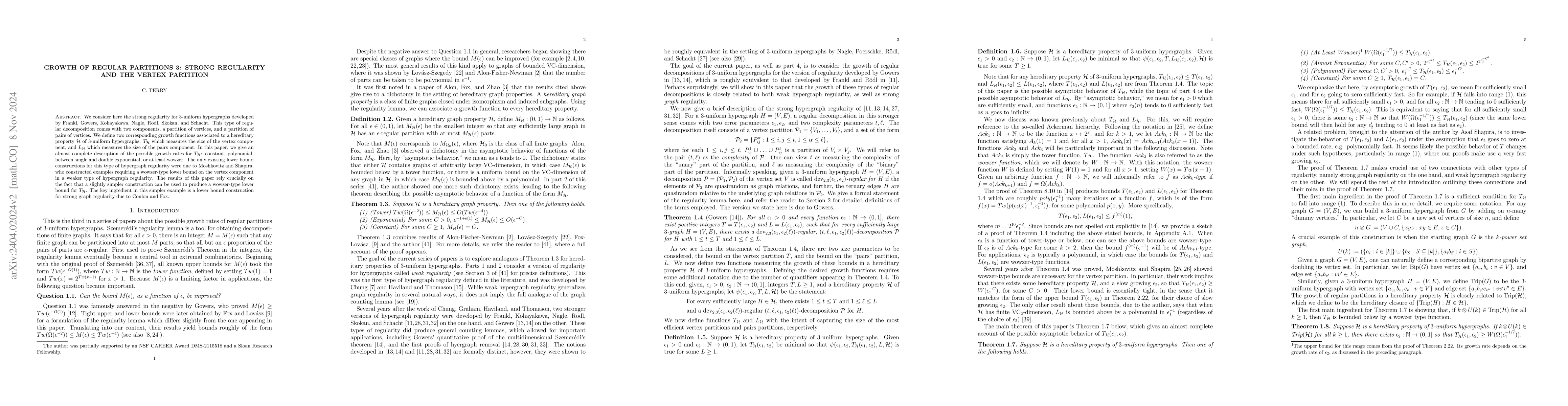 This paper investigates the growth of strong regularity in $3$-uniform hypergraphs, focusing on the vertex partition component, and classifies its possible growth rates. It utilizes a simpler construction to achieve a wowzer-type lower bound for the vertex partition growth function $T_{\mathcal{H}}$, building on results from Conlon and Fox.