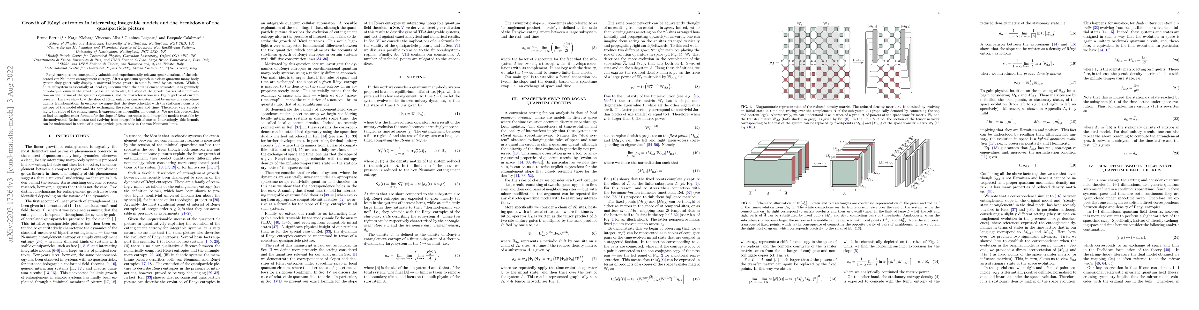 This paper demonstrates that the growth rate of Rényi entropies in integrable quantum systems can be linked to the stationary entropy density of a dual spacetime model, revealing an equilibrium interpretation for the growth phase. It provides an exact formula for this growth rate in all integrable models solvable via the thermodynamic Bethe ansatz, showing that this quasiparticle picture holds only in the von Neumann limit.