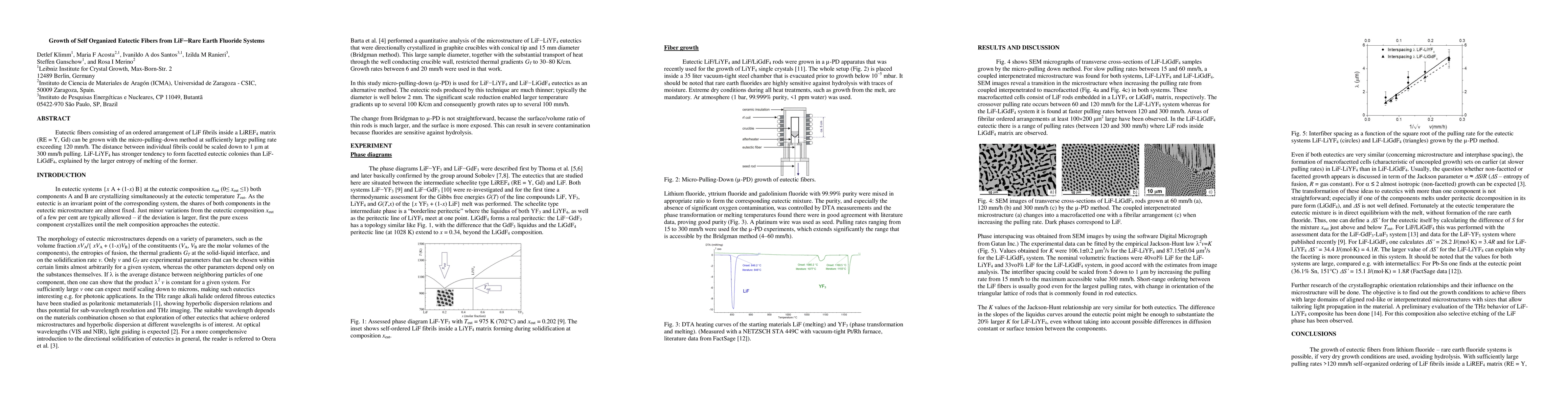 This study details the growth of self-organized eutectic fibers using the micro-pulling-down method, showing that LiF fibrils within a LiREF4 matrix (RE = Y, Gd) can be produced at high pulling rates, with interfibril distances reduced to 1 micrometer. LiF-LiYF4 fibers exhibit a stronger tendency to form facetted colonies due to higher melting entropy compared to LiF-LiGdF4.