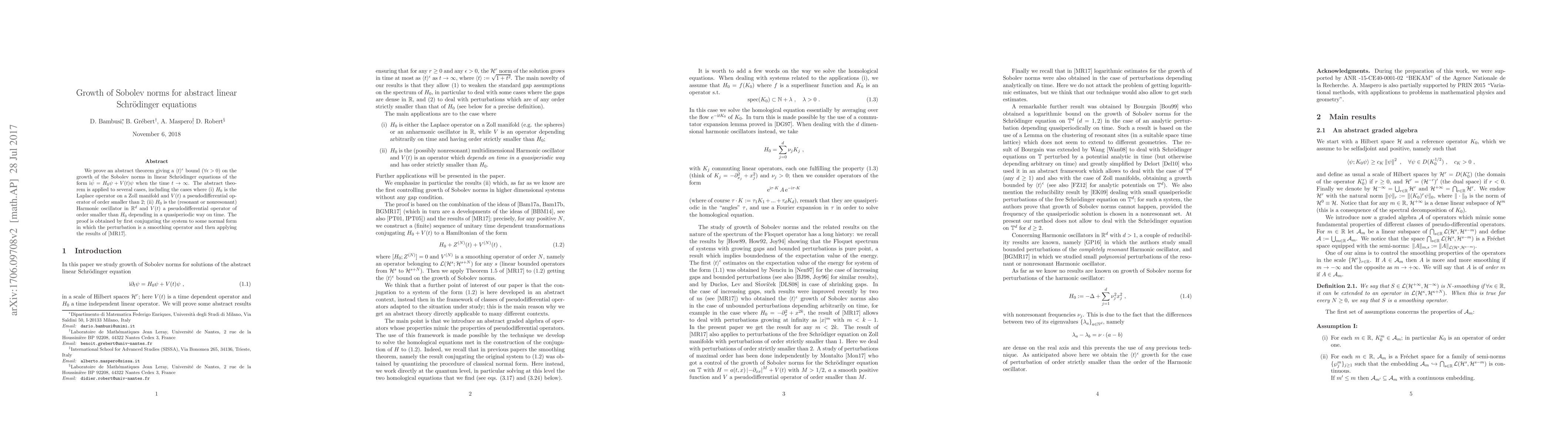 The paper proves an abstract theorem providing a ⟨t⟩^ε bound for the growth of Sobolev norms in linear Schrödinger equations, applicable to various cases including Zoll manifolds and harmonic oscillators.