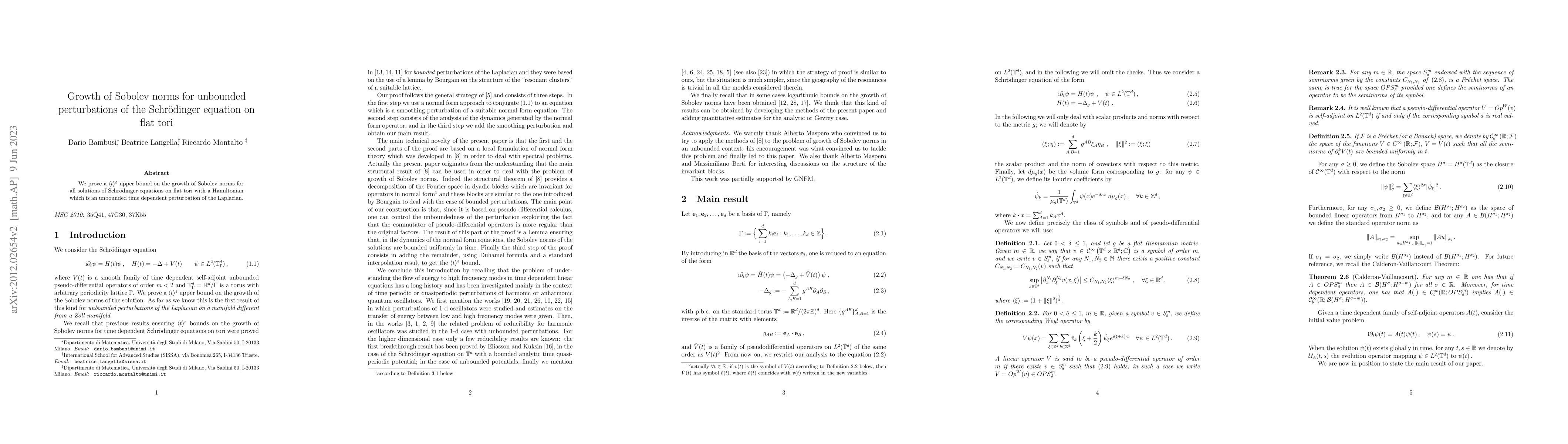 The paper introduces a time-dependent normal form approach to control the growth of Sobolev norms for unbounded perturbations of the Schrödinger equation on flat tori, providing a detailed proof and analysis of the conjugation of Hamiltonians under such perturbations.