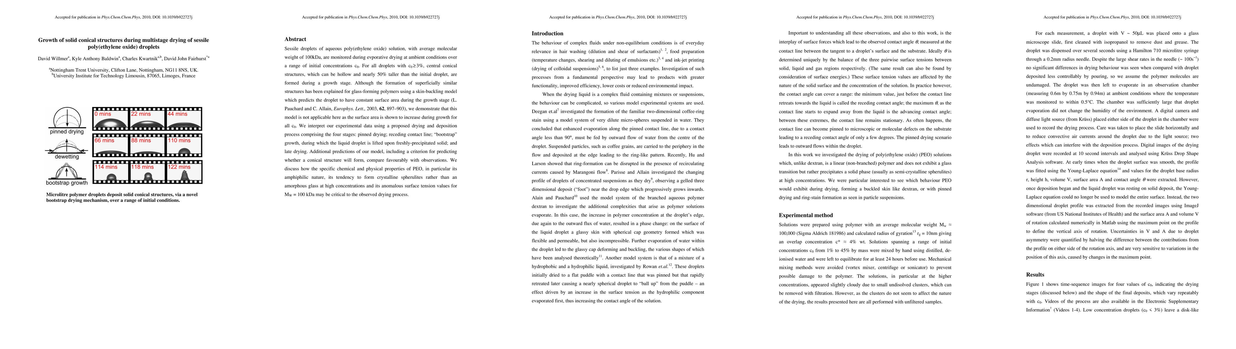 This study investigates the formation of solid conical structures during the drying of sessile poly(ethylene oxide) droplets, revealing that central conical structures form when initial concentrations are $c_0 \geq 3\%$. Contrary to existing models, the surface area increases during the growth stage, leading to a proposed four-stage drying and deposition process that better explains the observed phenomena.