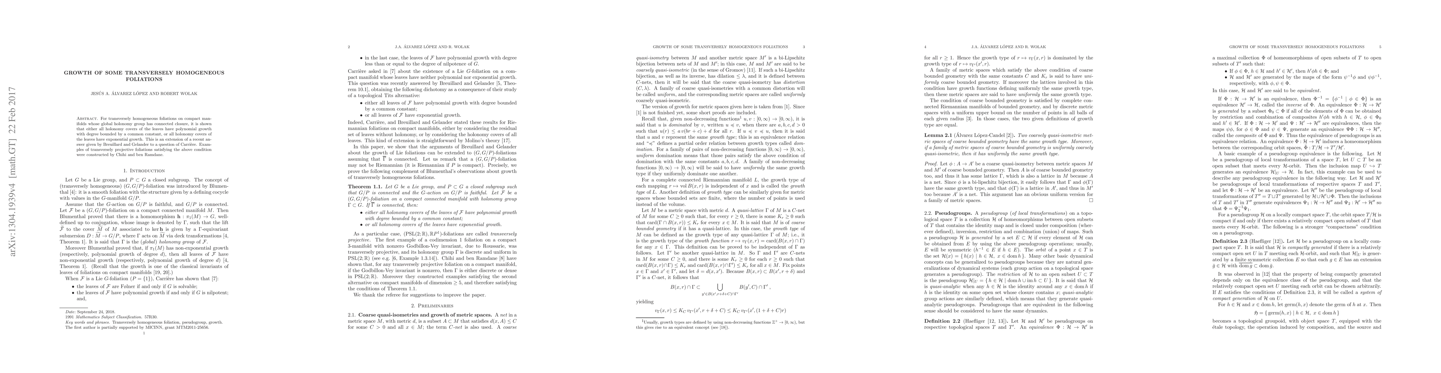 This paper proves that for certain transversely homogeneous foliations on compact manifolds, the holonomy covers of leaves exhibit either polynomial or exponential growth, extending prior work by Breuillard and Gelander. It follows the construction of examples by Chihi and ben Ramdane.