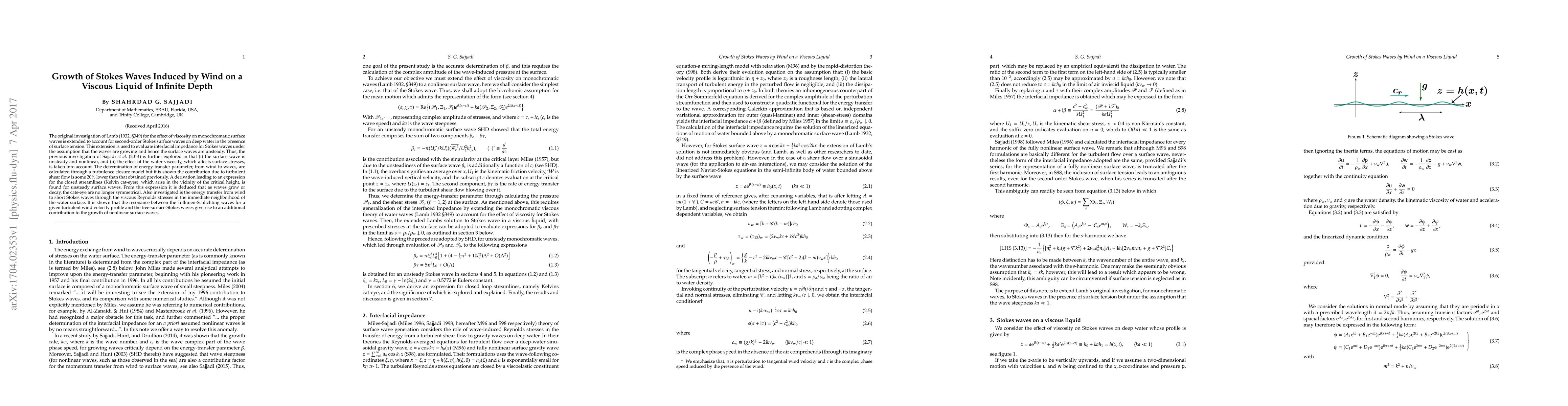 The original investigation of Lamb (1932, {\S}349) for the effect of viscosity on monochromatic surface waves is extended to account for second-order Stokes surface waves on deep water in the presence of surface tension. This extension is used to evaluate interfacial impedance for Stokes waves under the assumption that the waves are growing and hence the surface waves are unsteady. Thus, the previous investigation of Sajjadi et al. (2014) is further explored in that (i) the surface wave is unsteady and nonlinear, and (ii) the effect of the water viscosity, which affects surface stresses, is taken into account. The determination of energy-transfer parameter, from wind to waves, are calculated through a turbulence closure model but it is shown the contribution due to turbulent shear flow is some 20% lower than that obtained previously. A derivation leading to an expression for the closed streamlines (Kelvin cat-eyes), which arise in the vicinity of the critical height, is found for unsteady surface waves. From this expression it is deduced that as waves grow or decay, the cats-eye are no longer symmetrical. Also investigated is the energy transfer from wind to short Stokes waves through the viscous Reynolds stresses in the immediate neighborhood of the water surface. It is shown that the resonance between the Tollmien-Schlichting waves for a given turbulent wind velocity profile and the free-surface Stokes waves give rise to an additional contribution to the growth of nonlinear surface waves.