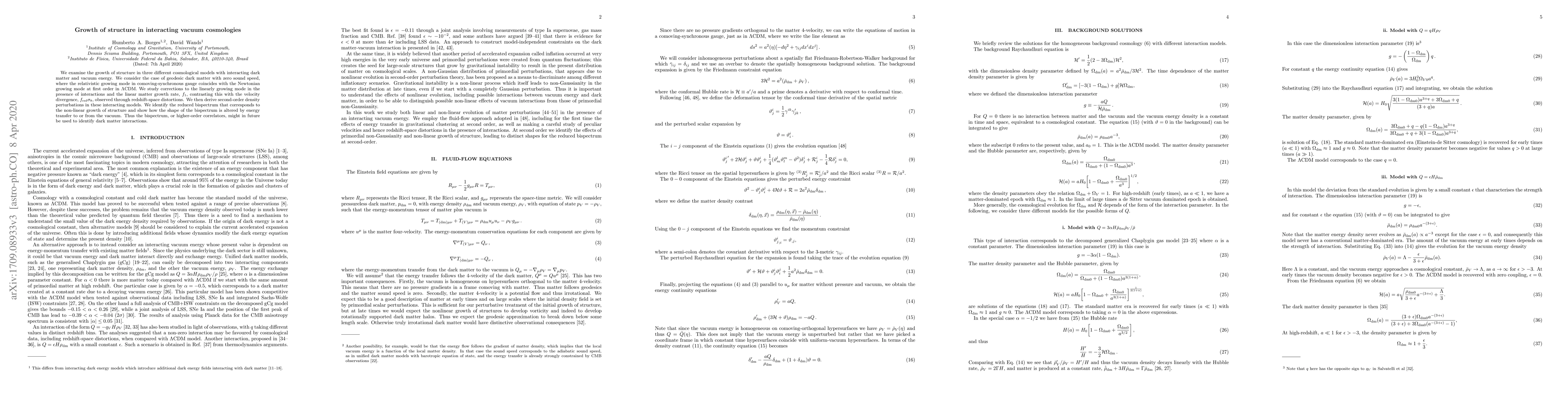 We examine the growth of structure in three different cosmological models with interacting dark matter and vacuum energy. We consider the case of geodesic dark matter with zero sound speed, where the relativistic growing mode in comoving-synchronous gauge coincides with the Newtonian growing mode at first order in $\Lambda$CDM. We study corrections to the linearly growing mode in the presence of interactions and the linear matter growth rate, $f_1$, contrasting this with the velocity divergence, $f_{rsd}\sigma_8$, observed through redshift-space distortions. We then derive second-order density perturbations in these interacting models. We identify the reduced bispectrum that corresponds to the non-linear growth of structure and show how the shape of the bispectrum is altered by energy transfer to or from the vacuum. Thus the bispectrum, or higher-order correlators, might in future be used to identify dark matter interactions.