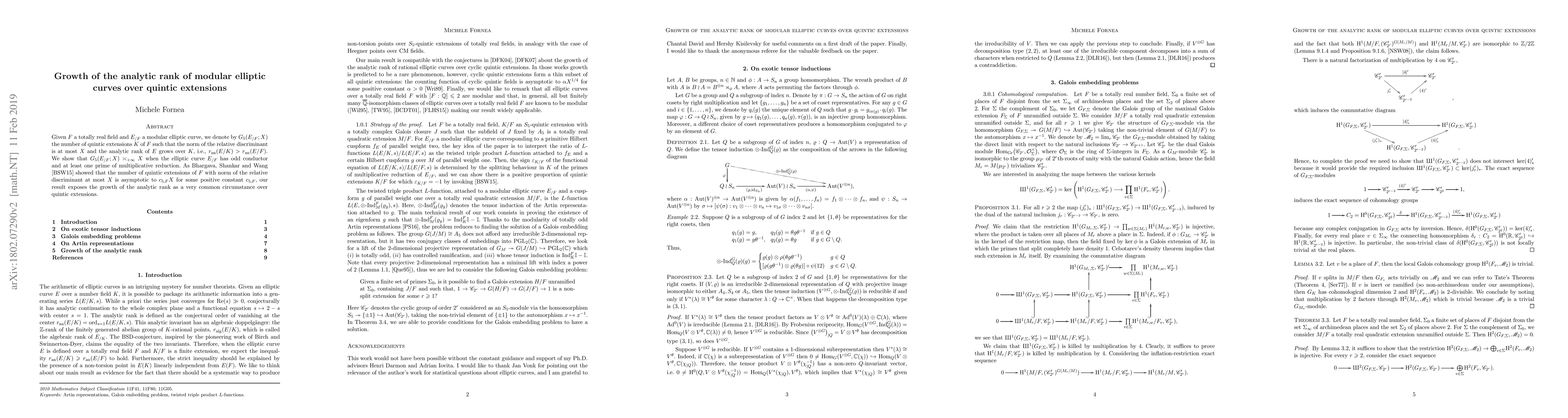 This research paper shows that the growth of the analytic rank of modular elliptic curves over quintic extensions is asymptotic to X for curves with odd conductor and at least one prime of multiplicative reduction.