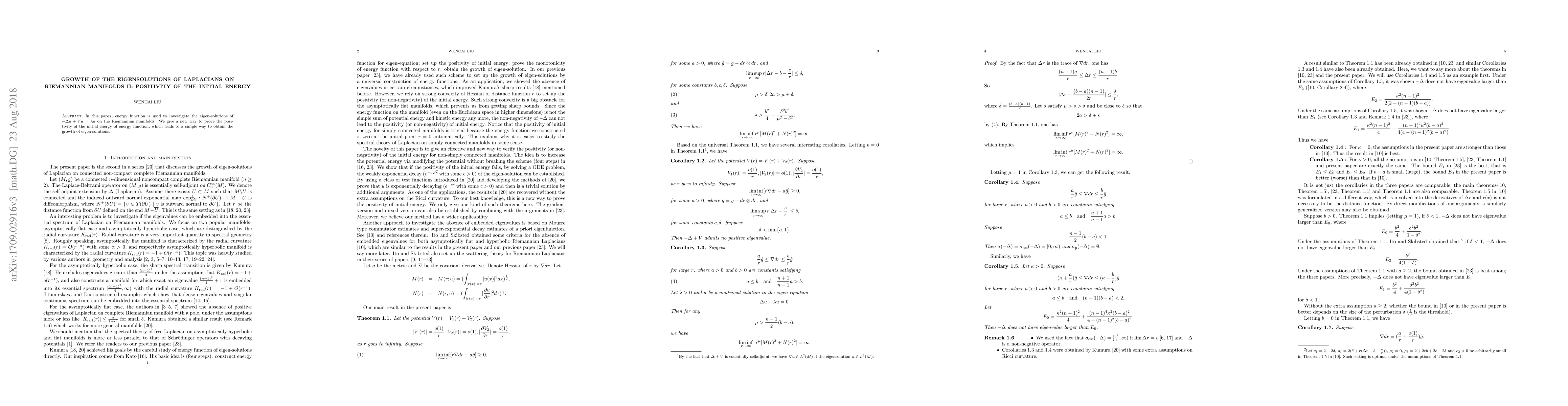 In this paper, energy function is used to investigate the eigen-solutions of $-\Delta u+ Vu=\lambda u$ on the Riemannian manifolds. We give a new way to prove the positivity of the initial energy of energy function, which leads to a simple way to obtain the growth of eigen-solutions.