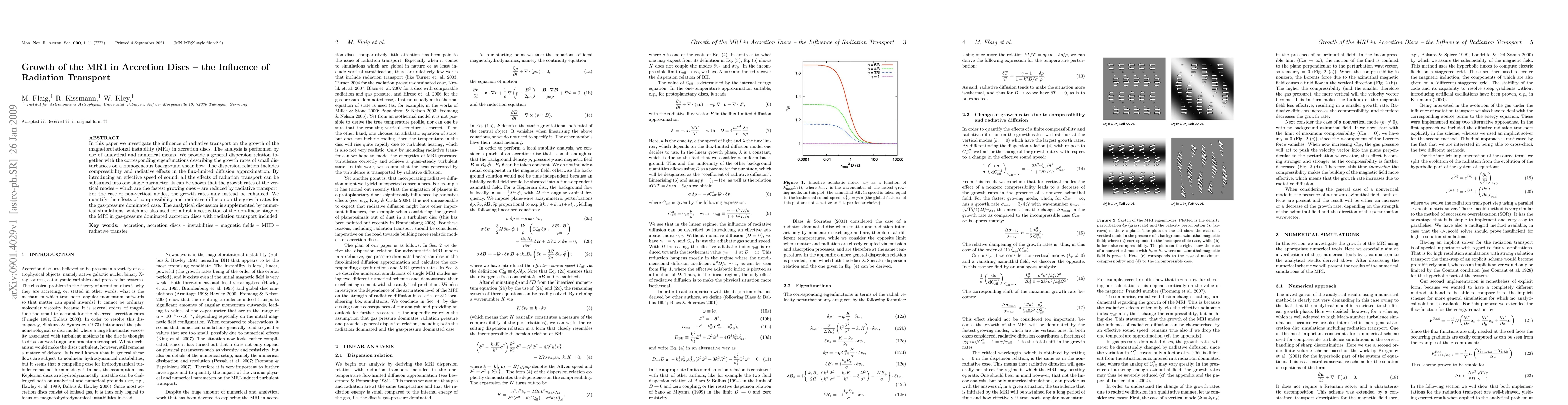 In this paper we investigate the influence of radiative transport on the growth of the magnetorotational instability (MRI) in accretion discs. The analysis is performed by use of analytical and numerical means. We provide a general dispersion relation together with the corresponding eigenfunctions describing the growth rates of small disturbances on a homogeneous background shear flow. The dispersion relation includes compressibility and radiative effects in the flux-limited diffusion approximation. By introducing an effective speed of sound, all the effects of radiation transport can be subsumed into one single parameter. It can be shown that the growth rates of the vertical modes -- which are the fastest growing ones -- are reduced by radiative transport. For the case of non-vertical modes, the growth rates may instead be enhanced. We quantify the effects of compressibility and radiative diffusion on the growth rates for the gas-pressure dominated case. The analytical discussion is supplemented by numerical simulations, which are also used for a first investigation of the non-linear stage of the MRI in gas-pressure dominated accretion discs with radiation transport included.