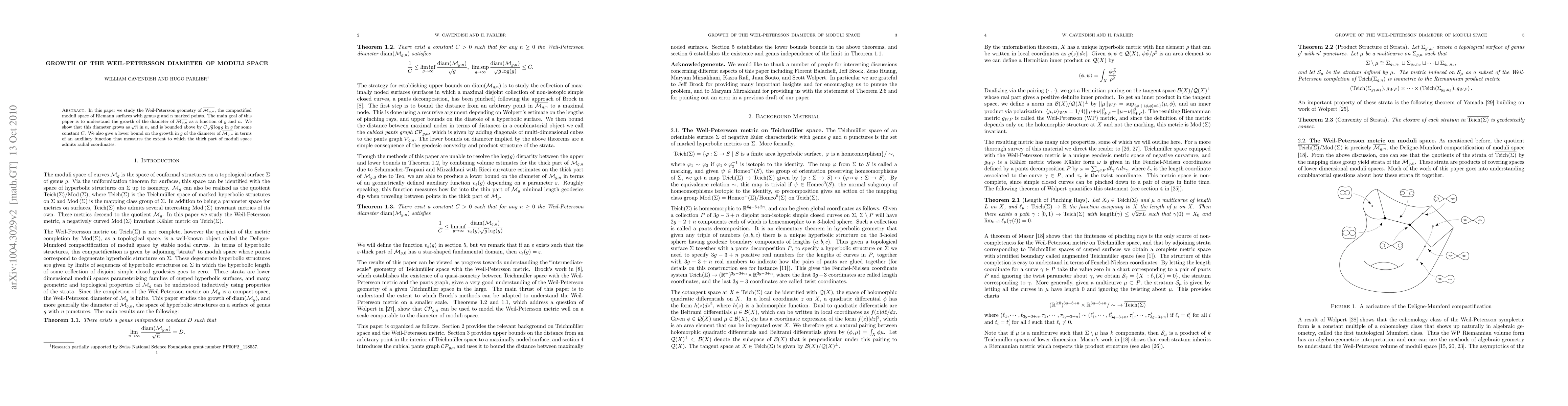 This paper investigates the Weil-Petersson geometry of the moduli space of Riemann surfaces, demonstrating that its diameter grows as $\sqrt{n}$ in $n$ and is bounded above by $C \sqrt{g}\log g$ in $g$, with a lower bound on the growth in $g$ linked to radial coordinates in the thick part of the moduli space.