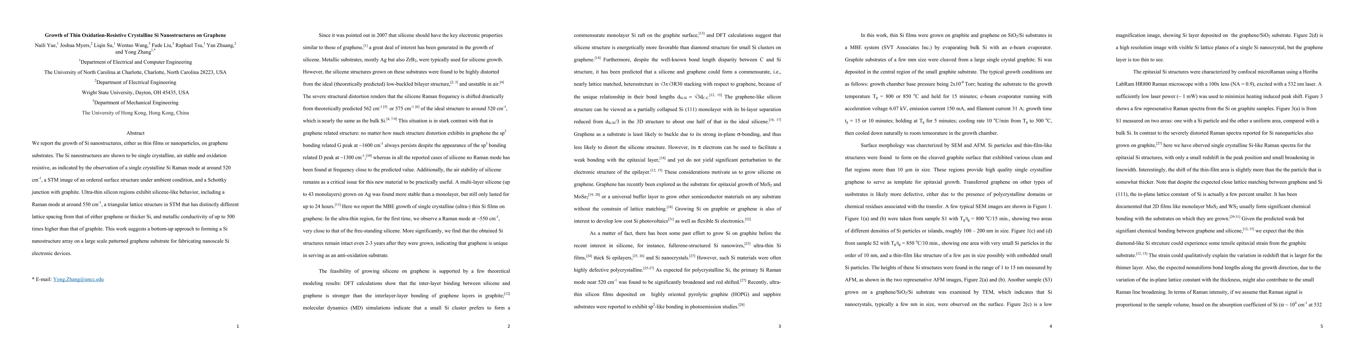 This paper reports the growth of single crystalline, oxidation-resilient Si nanostructures on graphene, demonstrating their air stability and unique silicene-like properties, including enhanced metallic conductivity. The study proposes a scalable method for creating Si nanostructures on patterned graphene for advanced electronic devices.